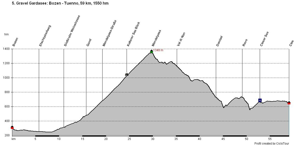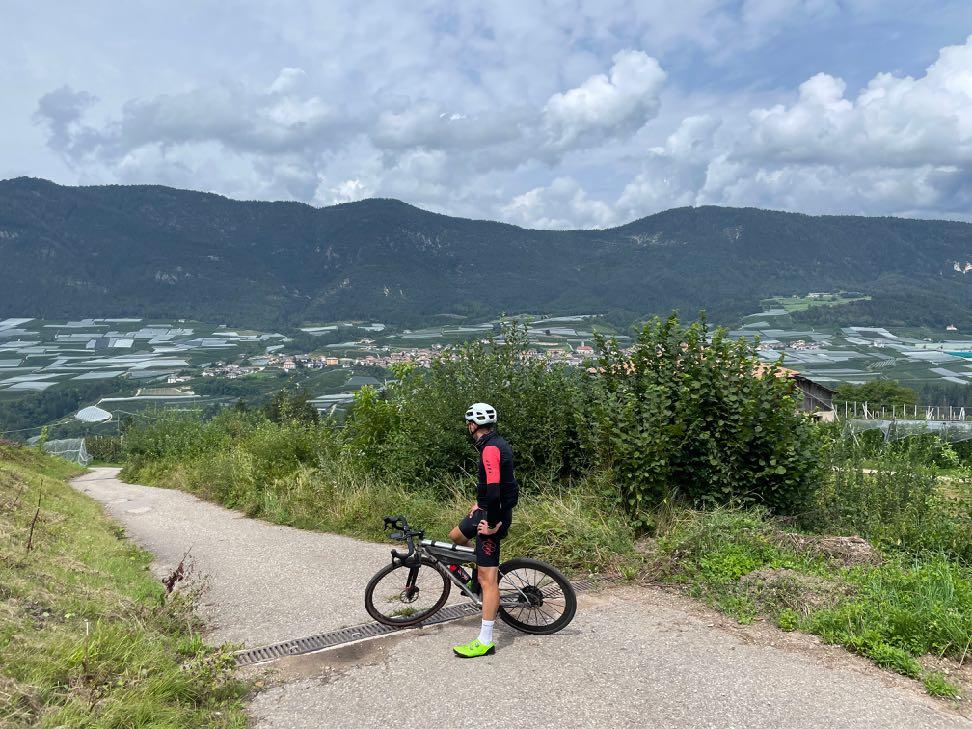 Gravelbike Transalp Lake Garda 5. Stage - 59 km - 1550 m elevation gain from Bolzano to TuennoWe leave the provincial capital of South Tyrol and set our sights on the Mendel Pass. A well-maintained cycle path leads directly from the city up to Lake Kaltern. The gradient on the route of the former railroad line is limited. We cycle traffic-free through apple orchards, vineyards and tunnels. This is where South Tyrol shows its most beautiful and richest side. Old castles and respectable manor houses lie along the way. Trade has made the region rich for centuries. This wealth was also responsible for the Austrian Emperor having an adventurous road project built here almost 150 years ago. The extremely steep mountain flank of the Mendelkamm was considered almost unconquerable at the time. Today, the road is particularly popular among racing cyclists. The average gradient of the 14 kilometre route is 6,5 percent, including ramps of up to 12 percent. In the upper section,