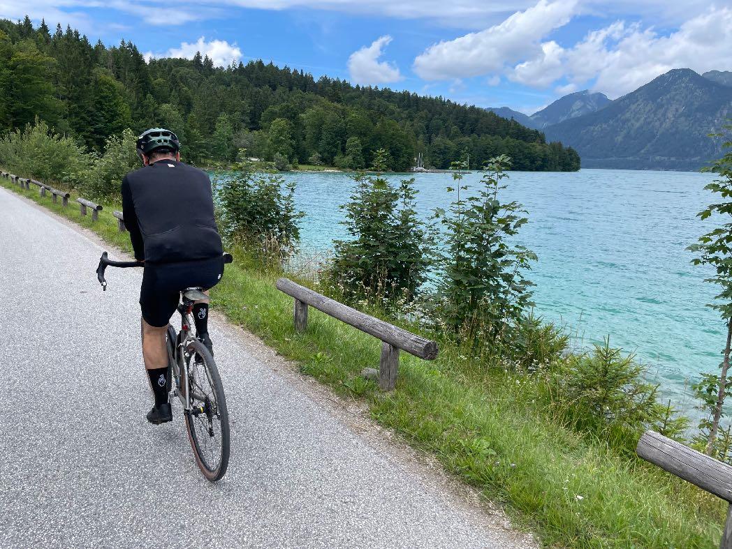 We reach the sunny Jachenau Valley via the most beautiful gravel sections. Cycle path, gravel and short trails alternate. We continue along the toll road to the turquoise-blue Lake Walchen. It is rightly nicknamed the "Bavarian Caribbean". What a panorama. The Karwendel and Werdenfels mountains lie before us in all their glory. Munich's local mountains; Herzogstand, Joch- & Setzberg and Heimgarten right next to us. There are also a few surfers in the lake. We decide for the western shore and take the cycle path to Wallgau. We