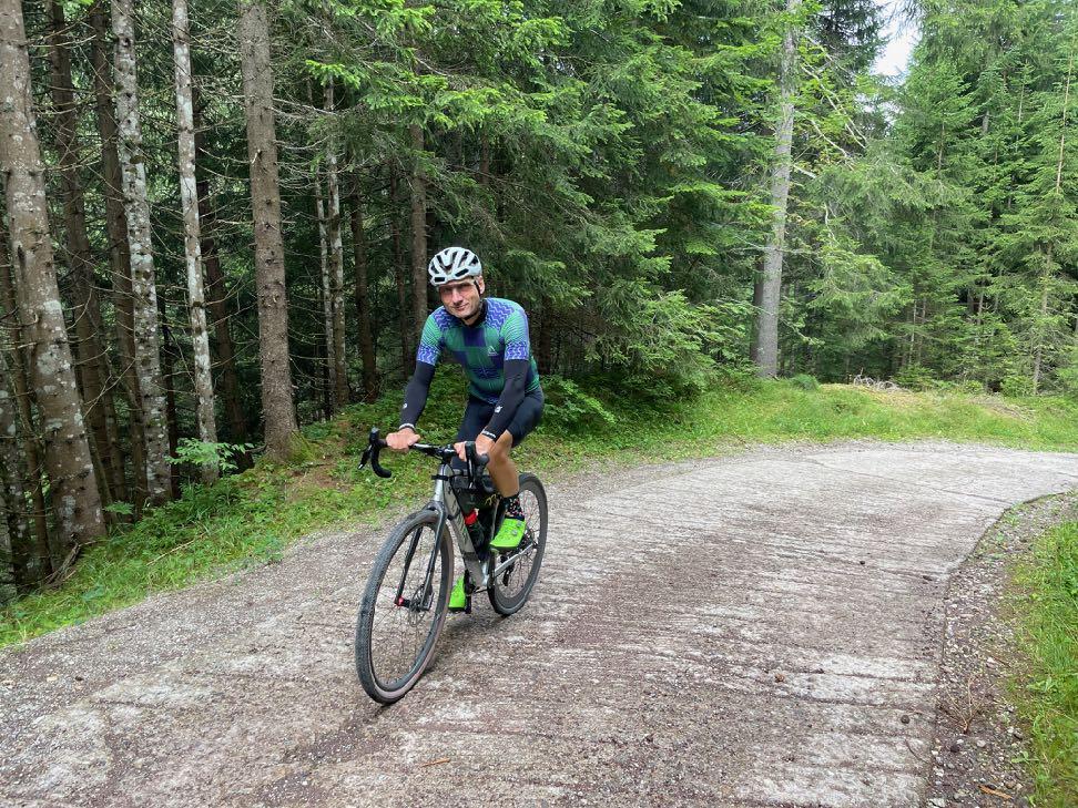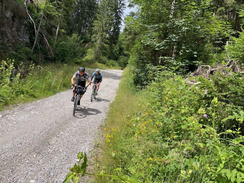 This sporty Gravelbike Transalp can only be tackled with a modern gravel bike. We recommend 180 mm front disks, 12-speed gears with mountain-compatible gear ratios (1x: 40 front, up to 50 rear, 2x: 46-30 front, 42 rear). Tires with good tread and at least 40 mm wide. We recommend to abandon the backpack and instead ride with frame or handlebar bags.