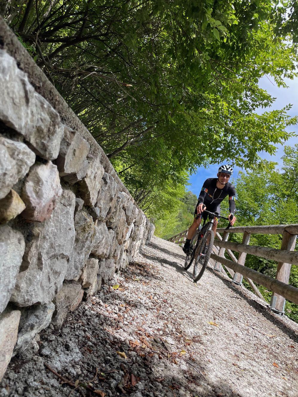 Gravelbike Transalp Lake Garda 6. stage - 86 km - 1300 m elevation gain from Tuenno to Lake GardaOff we go to the grand finale. Lake Garda is calling! The elevation profile tells every expert: today will be a long and tough gravel day. Almost another 90 kilometers need to be conquered. So we start early and begin spectacularly. The "Galleria de Terres" turns out to be a gravel bike highlight of a special kind. A three-kilometre-long water tunnel runs gently downhill through the mountain. Don't forget a light here! The adventurous ride spits us out directly at another highlight. The Brenta Bike Trail swings largely along a contour line for 20 kilometers in the forest on the edge of the Val di Non valley. Great views open up again and again. The trail is also pure enjoyment for experienced gravel bikers. At the end, it gets partly very technical. From Sporminore onwards, our tires feel asphalt again. We quickly reach Lago di Molveno via Andalo. First along Lago di Molveno, then the final climb towards Ranzo. From here, the mountain giants of the Brenta Dolomites are once again close enough to touch. A few kilometers
