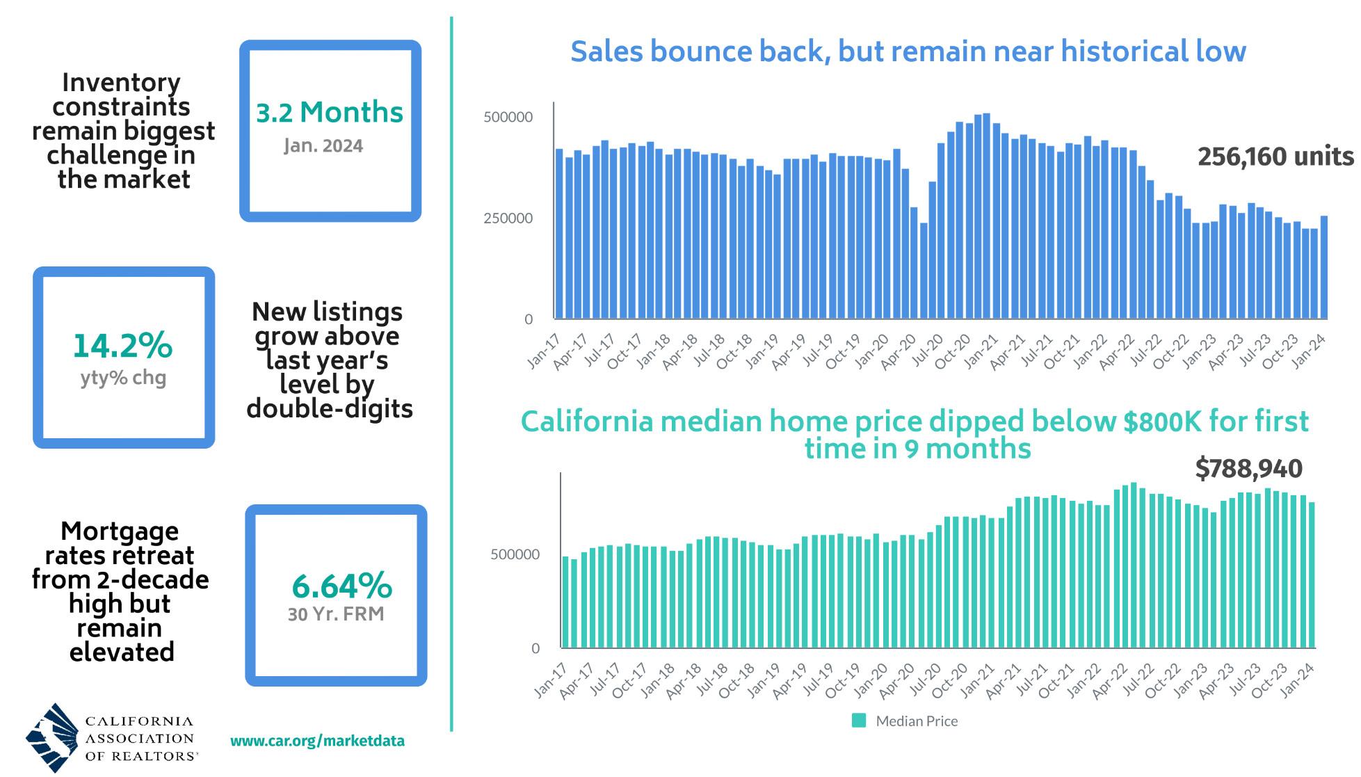 THE FACTS: California’s housing market started the year off right with existing home sales rebounding in January 2024 to the highest level in six months as mortgage rates pulled back sharply at the end of 2023, according to data from the California Association of Realtors (CAR).