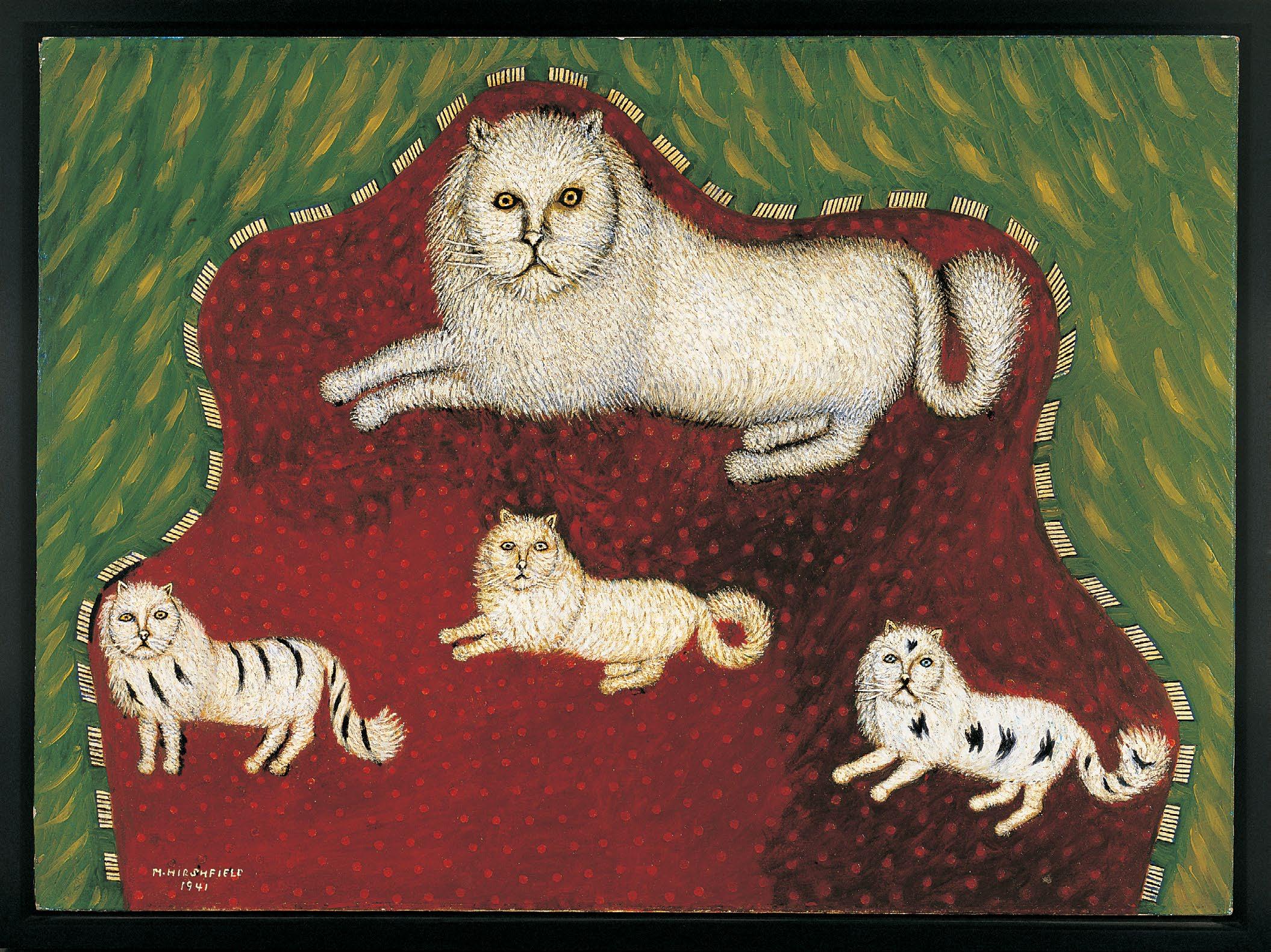 In 1941, MoMA presented “a new installation” of its permanent collection. While the museum’s storied collection has been on display in one version or another virtually ever since, such exhibitions were not a museum convention at the time. Prior to viewing works by Gauguin, Cézanne, Matisse, and Picasso, visitors entered a gallery devoted to Modern Primitives: Artists of the People, eighteen non-professional, self-taught painters from France, Britain, and the United States. Rather than positioning these artists as subordinate to the European avantgarde, the museum offered their works as visually innovative and genuinely original expressions of modernity. Among the paintings on display were ten newly acquired works of self-taught art, including Hirshfield’s Tiger and Girl in a Mirror