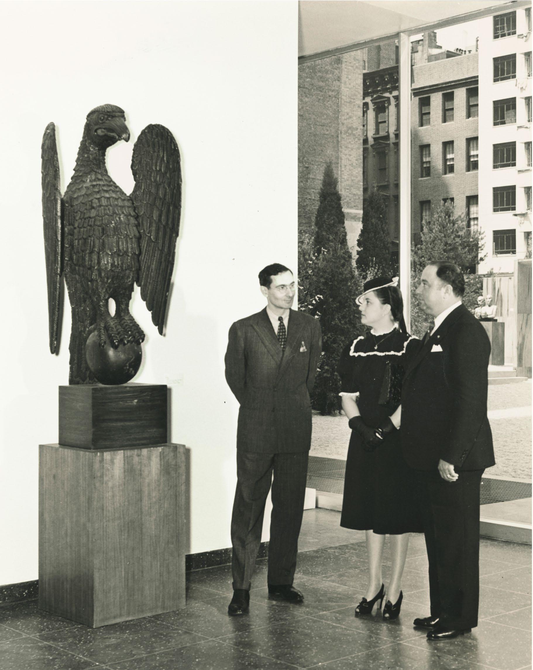 In a favorite photograph from The Museum of Modern Art Archives, dapper young Director Alfred H. Barr, Jr. stands with then President of Nicaragua Anastasio Somoza and his daughter Lillian Somoza [Figure 1]. The visit, and the clearly staged press image that commemorated it, date to May 1939, the occasion of MoMA’s 10th anniversary. Marked by a series of exhibitions titled “Art in Our Time,” the anniversary also celebrated the museum’s opening of its first bespoke building space; the caption provided for the photo highlights Somoza’s visit to “the new $2,000,000 glass-walled building of The Museum of Modern Art.”1 The most striking element of the photograph, however, is not the people or the building, but rather the towering sculpture at left: a five-and-a-half foot tall carved eagle, purportedly made for a Rhode Island Tavern.2 Wooden, figurative (or rather avian), and by an unidentified American artist, this sculpture seems an odd choice as the sole visible art object representing a museum that played a decisive role in defining the “modern” and “contemporary” in art in the first half of the twentieth century. In 1939, however, it was neither a curiosity nor particularly remarkable. This wooden eagle, prominently displayed and promoted, is rather evidence of how the art that MoMA referred to as “American folk and popular art” was a critical part of the story of “Art in Our Time,” as told by the museum in its first decades.3