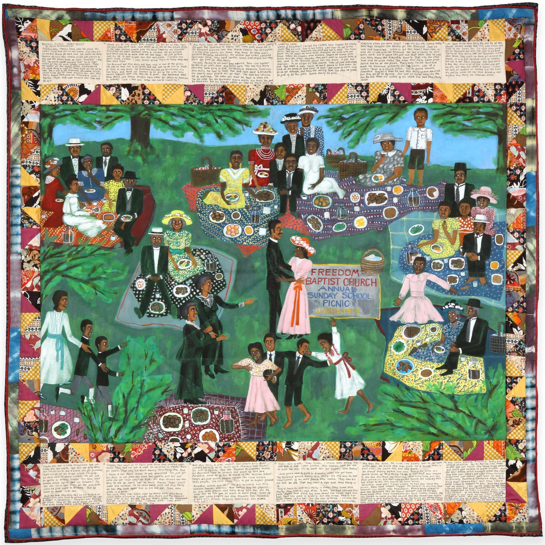 Church Picnic Story Quilt, 1988. Tie-dyed, printed fabrics and acrylic on cotton canvas, 74 1/2 x 75 1/2 in. High Museum of Art, Atlanta, Gift of Don and Jill Childress through the 20th-Century Art Acquisition Fund, 1988.28.