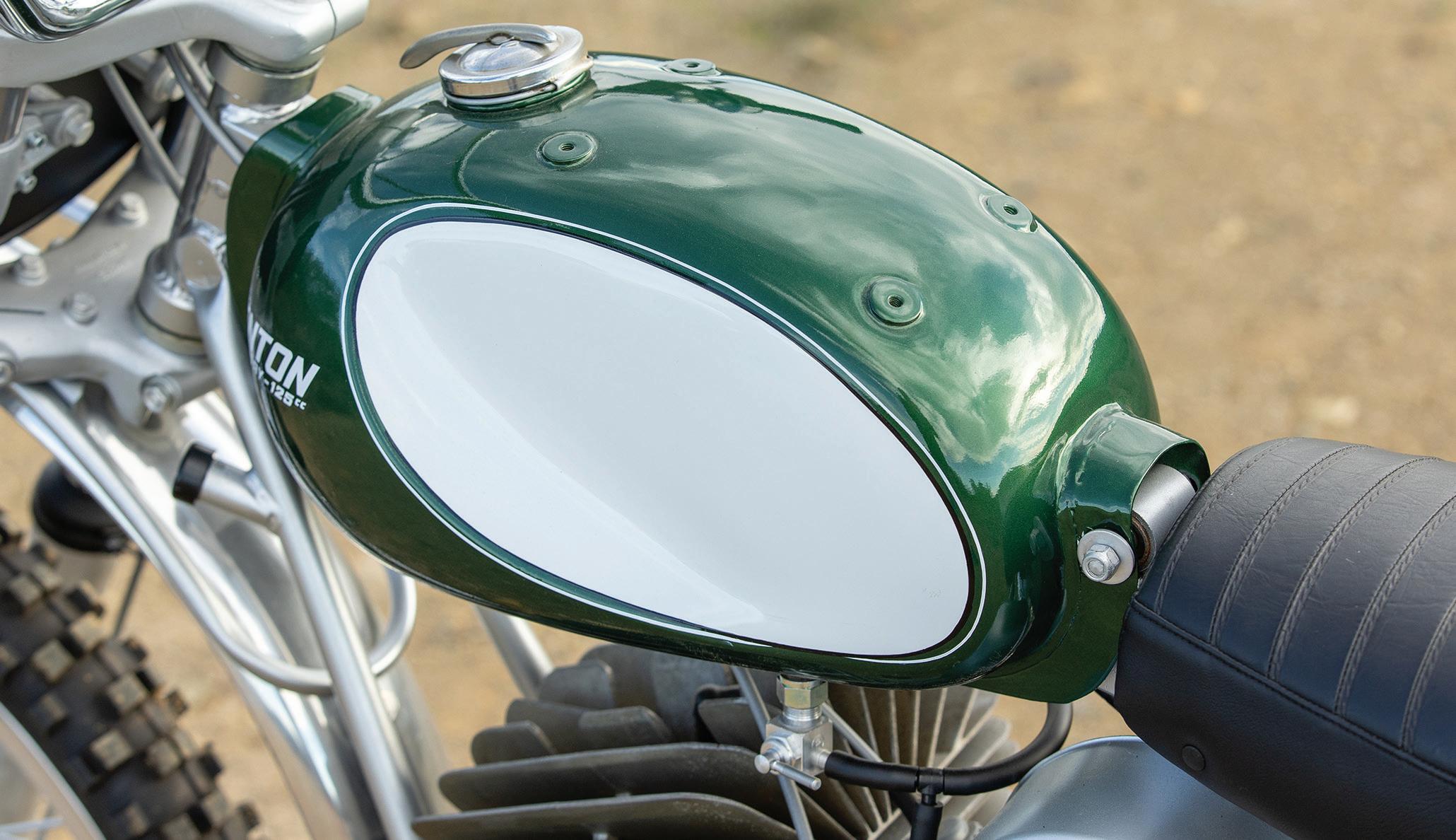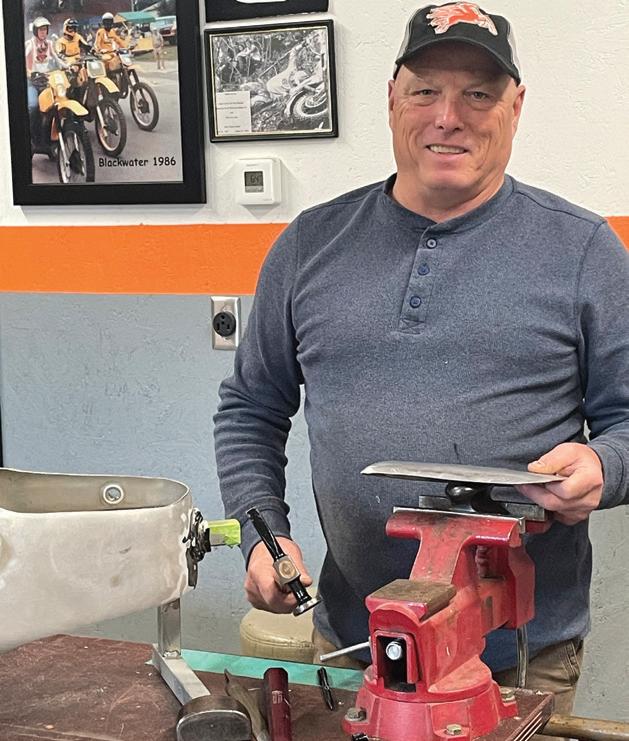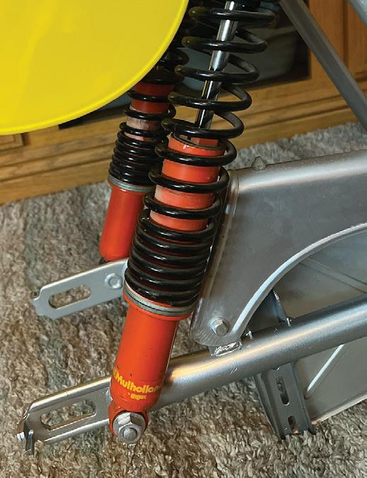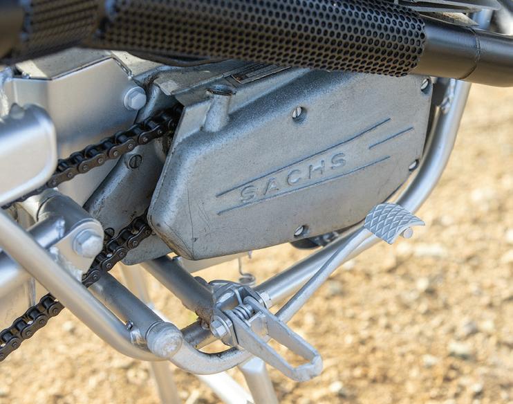 To get it back to mostly original condition I had to basically cut it into pieces, hammer, bend and re-form it from front to back, then re-braze and re-weld the entire thing back together before sanding and painting it. It was a ton of work, but having a real-deal E.C. Birt pipe on my Penton was worth the effort. The centerstand and skid plate needed more than help; they didn’t exist , which meant I had to fabricate these impossible-toget stock parts from scratch based on photos and info from some of the POG folks. Like the exhaust, it took a ton of work to get them just right, but again, it was worth it.