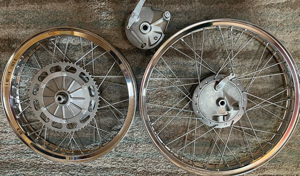 Other bits that needed big-time restoration were the trashed footpegs, bent rear frame rail and shifter, and wheels that featured rusty, non-stock rims – which I replaced with original Akronts, laced up with re-plated spokes.
