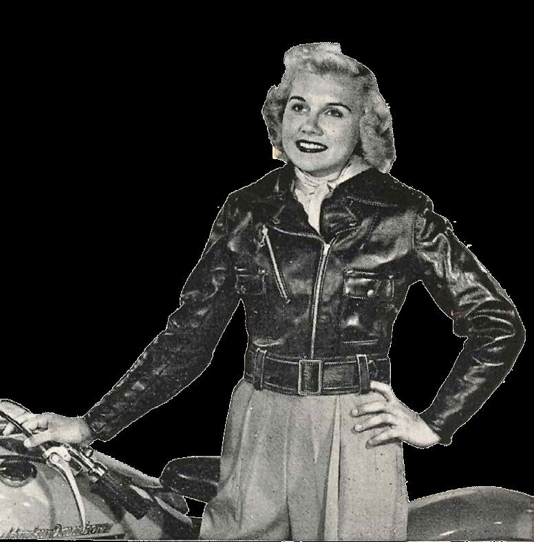 You’ll be the center of attraction in the Cycle Queen jacket, advertised Harley-Davidson. Warm and comfortable, too, thanks to the form-fitting weatherproof steer hide and nylon lining. Just $25.95…but to really wow the crowd you’ll want the $3.75 detachable fur collar. 1951