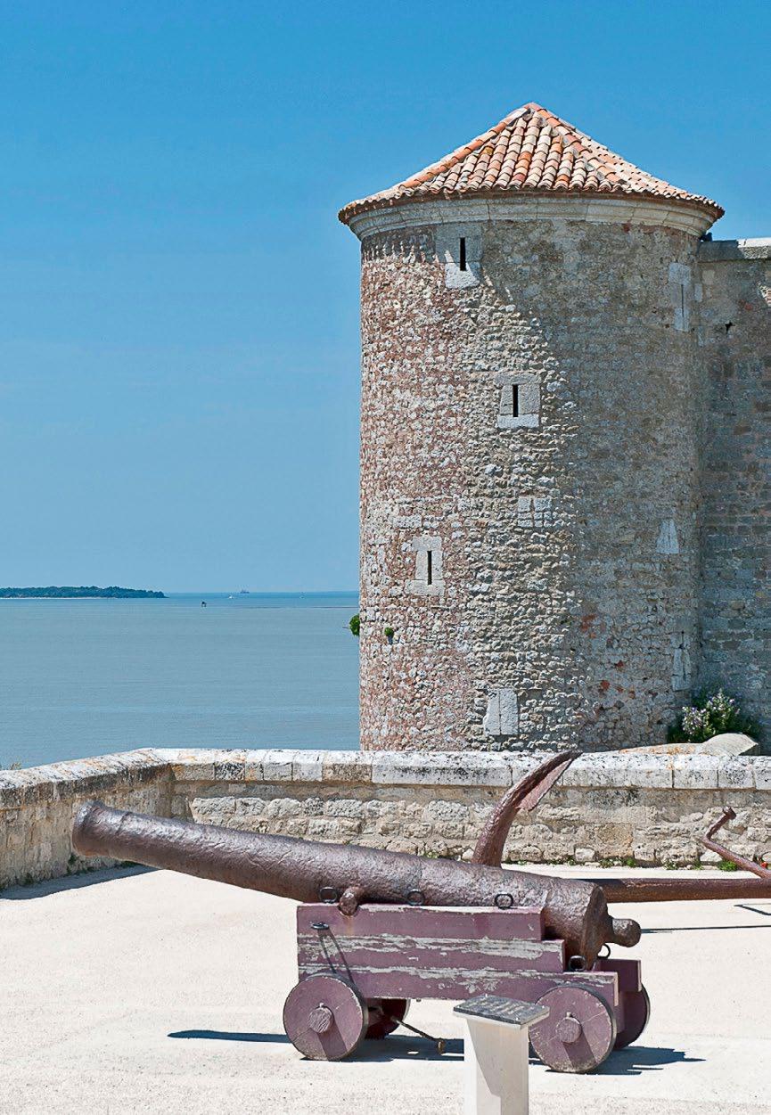 Nearby is another essential visit. The beautiful Romanesque Eglise Sainte-Radegonde sits defiantly beside a sheer cliff face at Talmont-sur-Gironde (below). Built by Edward I of England with echoes of the bastide towns of Aquitaine, the 13th century fortified town is a delight to explore. Round off your visit to the Royan area with a boat ride out to one of France’s oldest working lighthouses, the magnificent 16/18th century Phare de Cordouan, recently awarded UNESCO heritage status (right). Climb 300 or so steps for breathtaking views from the 67m-high summit.
