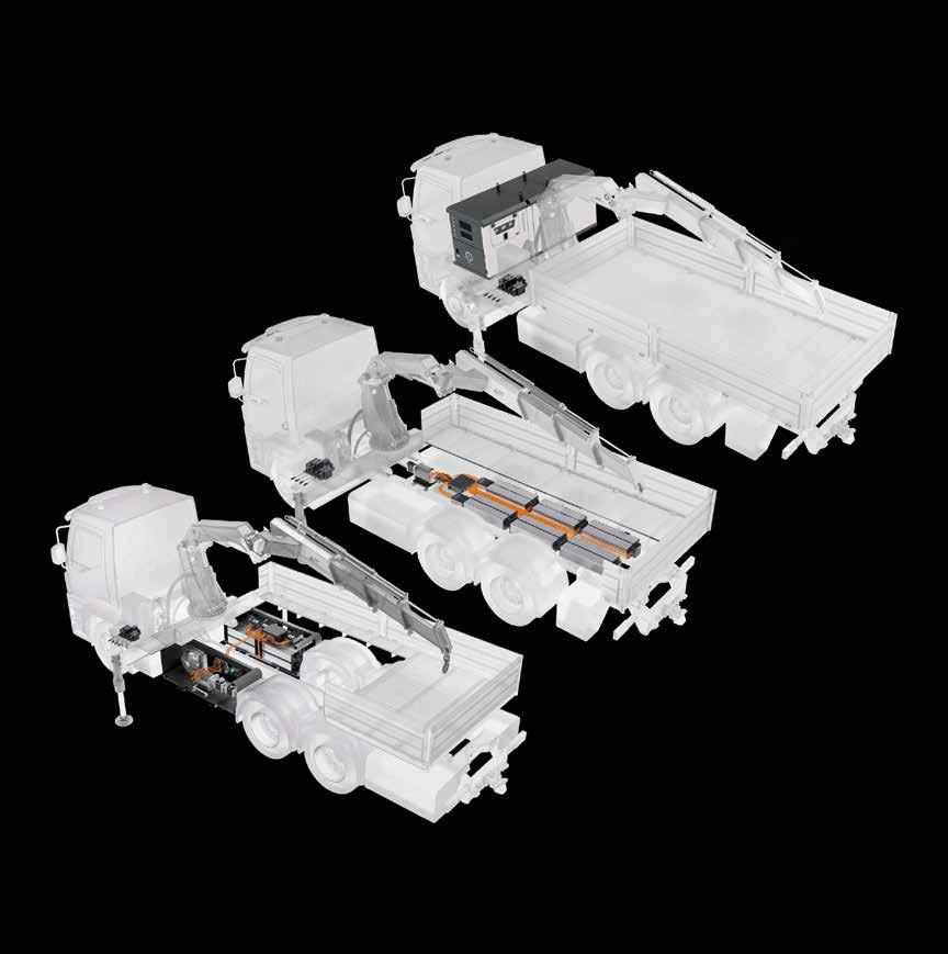 akkupaketti ohjauksineen ja latureineen PDU – yksikkö invertteri öljytankki sähkömoottori ja valitsemanne HAWE pumppu (MPU)