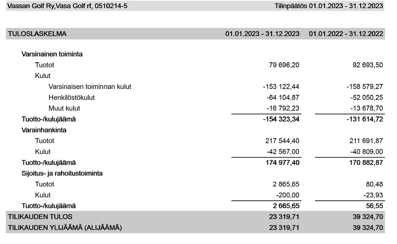 VAASAN GOLF RY TUloslaskelma ja tase