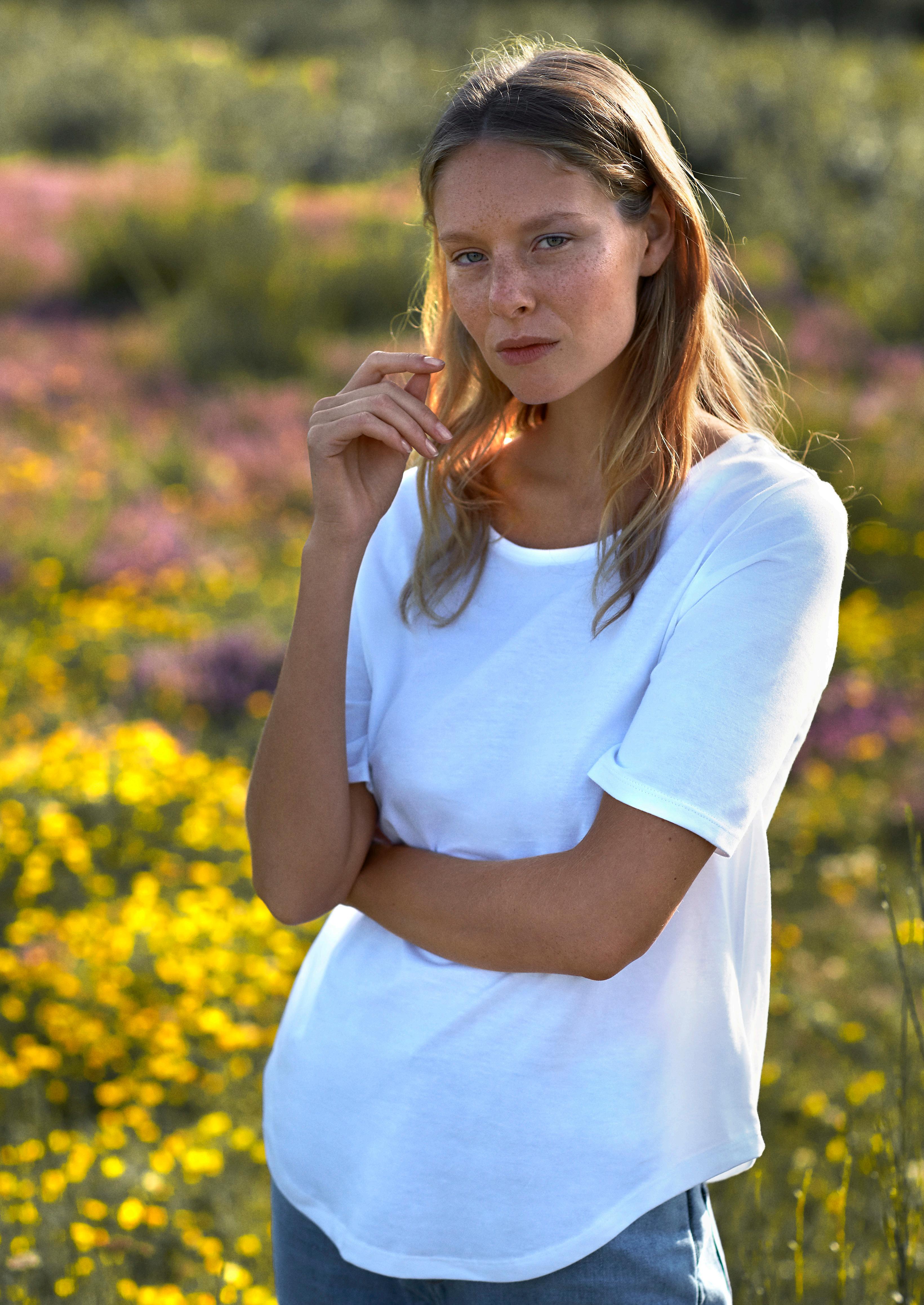 Loose fit / Elbow length sleeves / Curved Hem / Round scoop