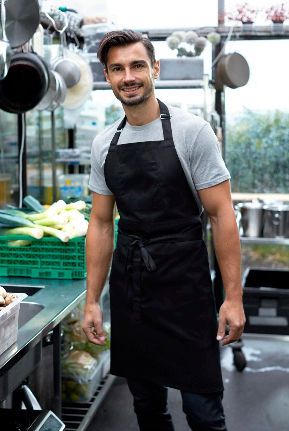 Extra Durable twill weaved cotton/rPET blend / Adjustable strap w. buckle at neck / Tie bands at waist / Two side pockets / Strap for kitchen towels / Two pencil pockets COLOURS