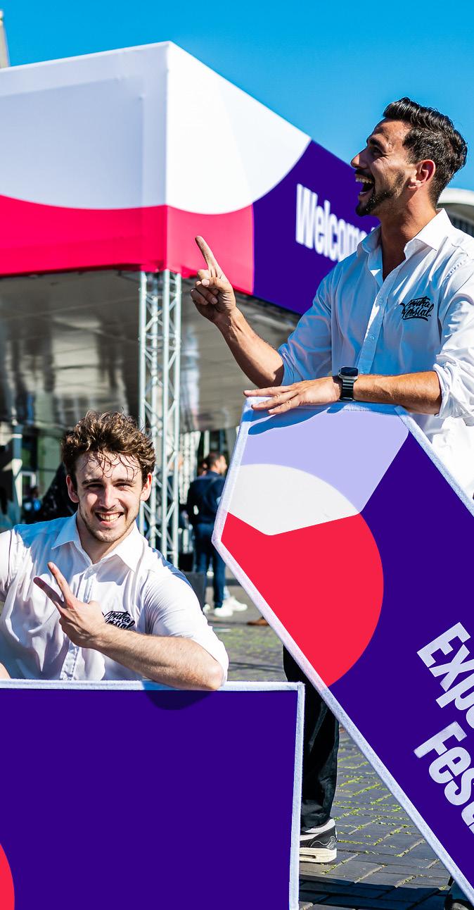 Get the best of both worlds and have a flyer team hand out samples or flyers. This is a highly effective way to send visitors to your stand and/or stimulate a dialogue with your eyecatching and attention-grabbing marketing object.