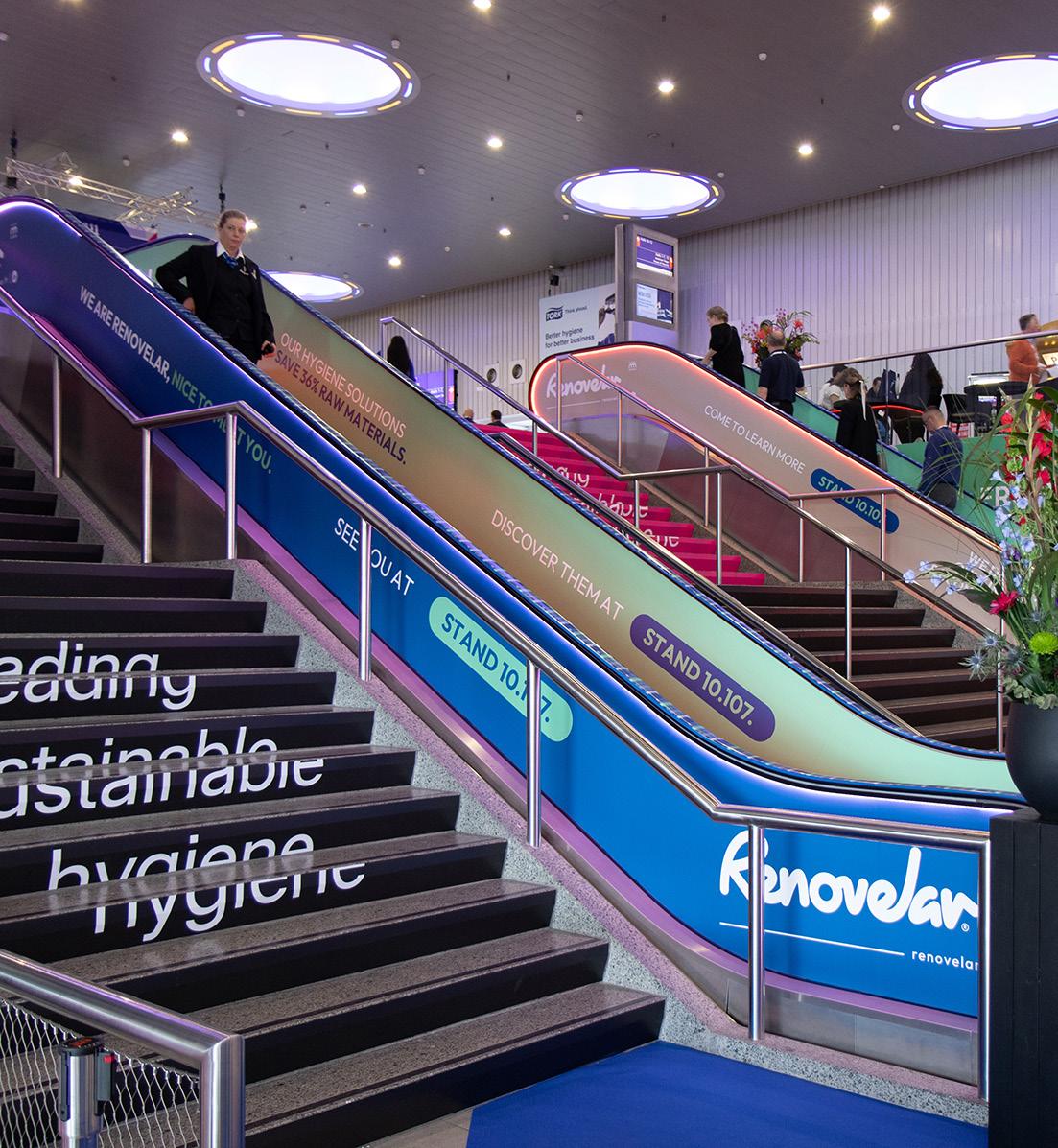 The window stickers on the sides of the escalator are a superb chance to create brand awareness. At some point during the show everyone will use these escalators, so they’re perfect to create immediate attention.