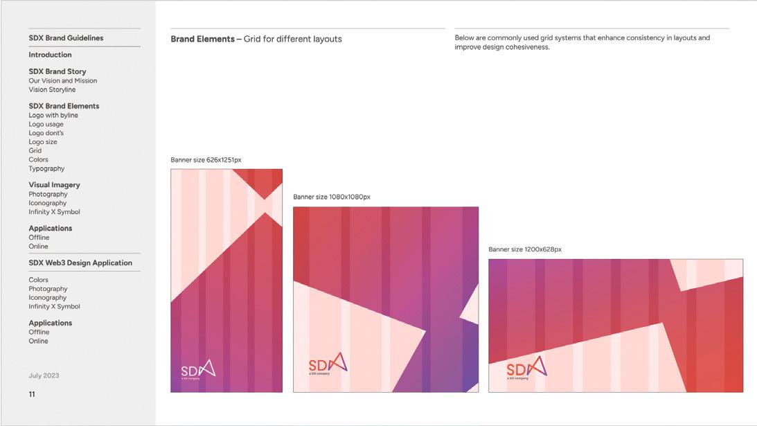 both offline and online (social media, presentations, business cards, website, mobile, etc.). And that’s not all. We also distinguished the core brand (SDX) from a product application (Web3), using the distinctive colors magenta and blue. The real added value for the SDX team lies in improved communications management and the simplification of everyday activities, all thanks to precise guidelines, a consistent brand system, and a shared, comprehensive tool for graphic assets management (Frontify).