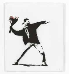 Love Is In The Air, also known as Flower Thrower, appeared for the first time in Jerusalem in 2003 as a stencil; it was painted on the wall built to separate the Israelis and Palestinians in the West Bank. The artist sees the wall as something that “[...] essentially transforms Palestine into the largest open-air prison in the world”. The same year, Banksy made the version seen here, set against a red background. Love Is In The Air alludes to and transforms the typical image of activists participating in the student riots in the United States and Great Britain during the Vietnam War, and takes its title from the famous 1977 song by Australian singer John Paul Young. Banksy mutates the image and upends the violent outcome of the young activist, placing a bunch of flowers in his hand, a symbol of peace and beauty. In his book Wall and Piece, the artist commented that, “The biggest crimes in the world aren’t committed by people who break the laws, but by those who follow the laws.”