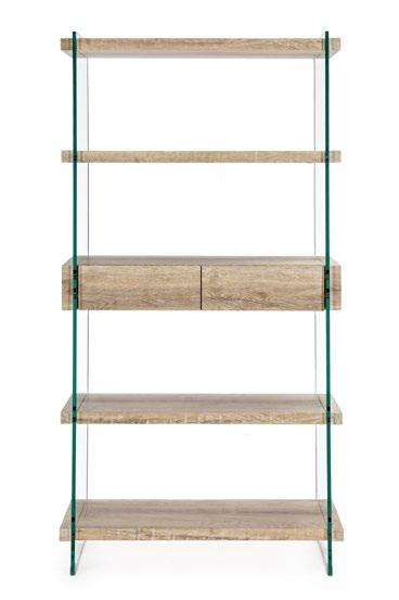Mensole e cassetti in MDF rivestito con carta melaminica effetto legno. Fianchi in vetro temperato spessore 12mm. Portata max mensola 2kg. Da assemblare. / MDF shelves and drawers covered with wood-effect melamine paper. Tempered glass sides thick 12mm. Shelf max load 2kg. To be assembled.