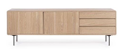 MDF impiallacciato legno di frassino. Finitura naturale con vernice a base d’acqua. Vano porte comprensivo di mensola. Interno cassetti di colore nero con guide scorrevoli in acciaio. Gambe in acciaio verniciate a polvere epossidica. Gambe da assemblare. / MDF ash wood veneer. Natural finishing with water- based paint. Door compartments including shelf. Inside drawers in black colour with steel sliding guides. Steel legs epoxy powder coated. Legs to be assembled.