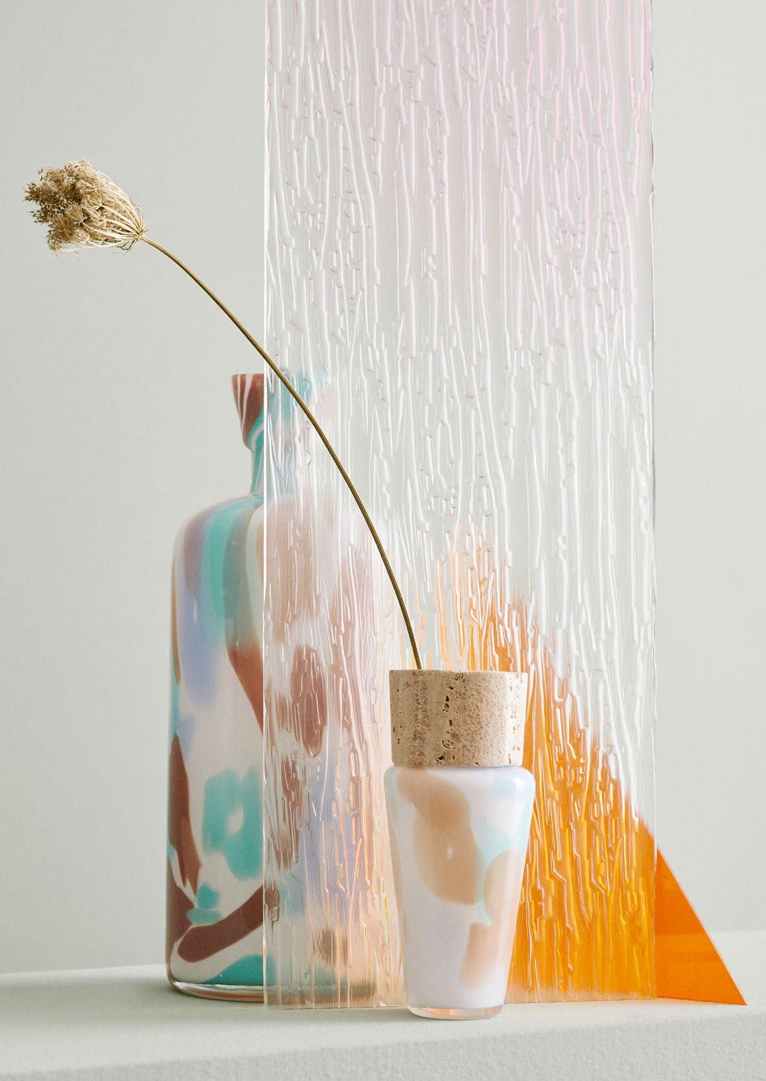 L’effetto della finitura satinata si ottiene levigando manualmente il vetro e lo si può ravvivare nel tempo utilizzando un panno morbido umido e lasciando asciugare la superificie.