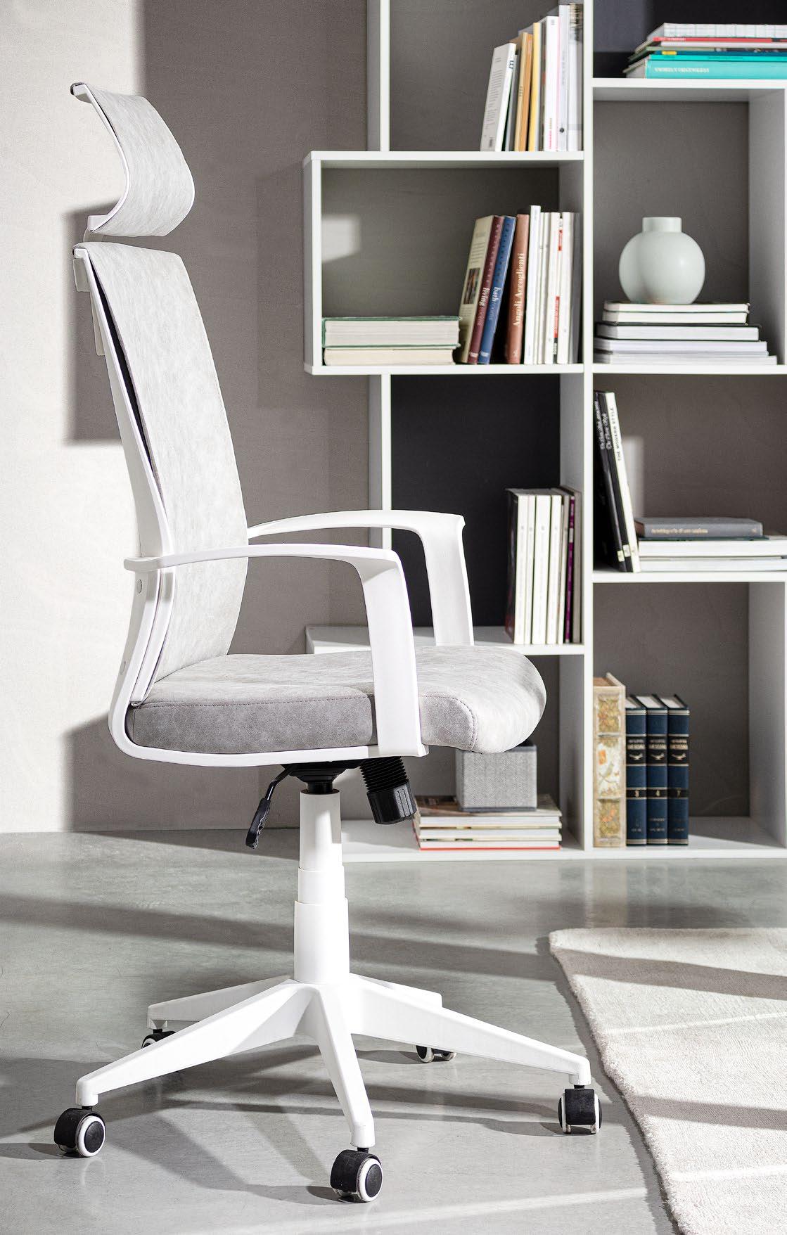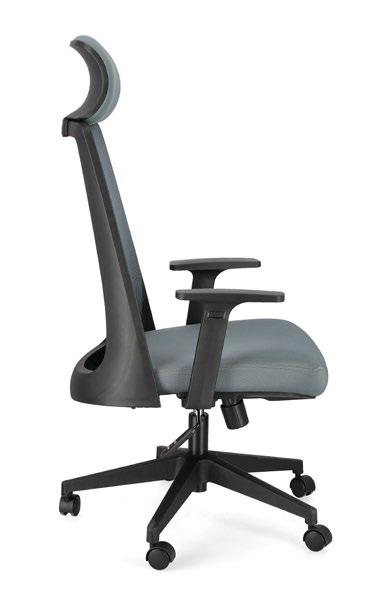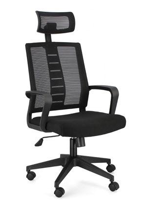 3, 4, Base in nylon ø60 cm. Ruote in plastica (PU). Seduta e poggiatesta imbottiti in schiuma poliuretanica e rivestiti in tessuto a rete poliestere 100%. Schienale in plastica (PP) rivestito in tessuto a rete poliestere 100%. Altezza regolabile. Da assemblare. | Nylon base ø60 cm. Plastic wheels (PU). Seat and headrest padded with polyurethane foam and covered with 100% polyester mesh. Plastic back (PP) covered in 100% polyester mesh. Height adjustable. To be assembled