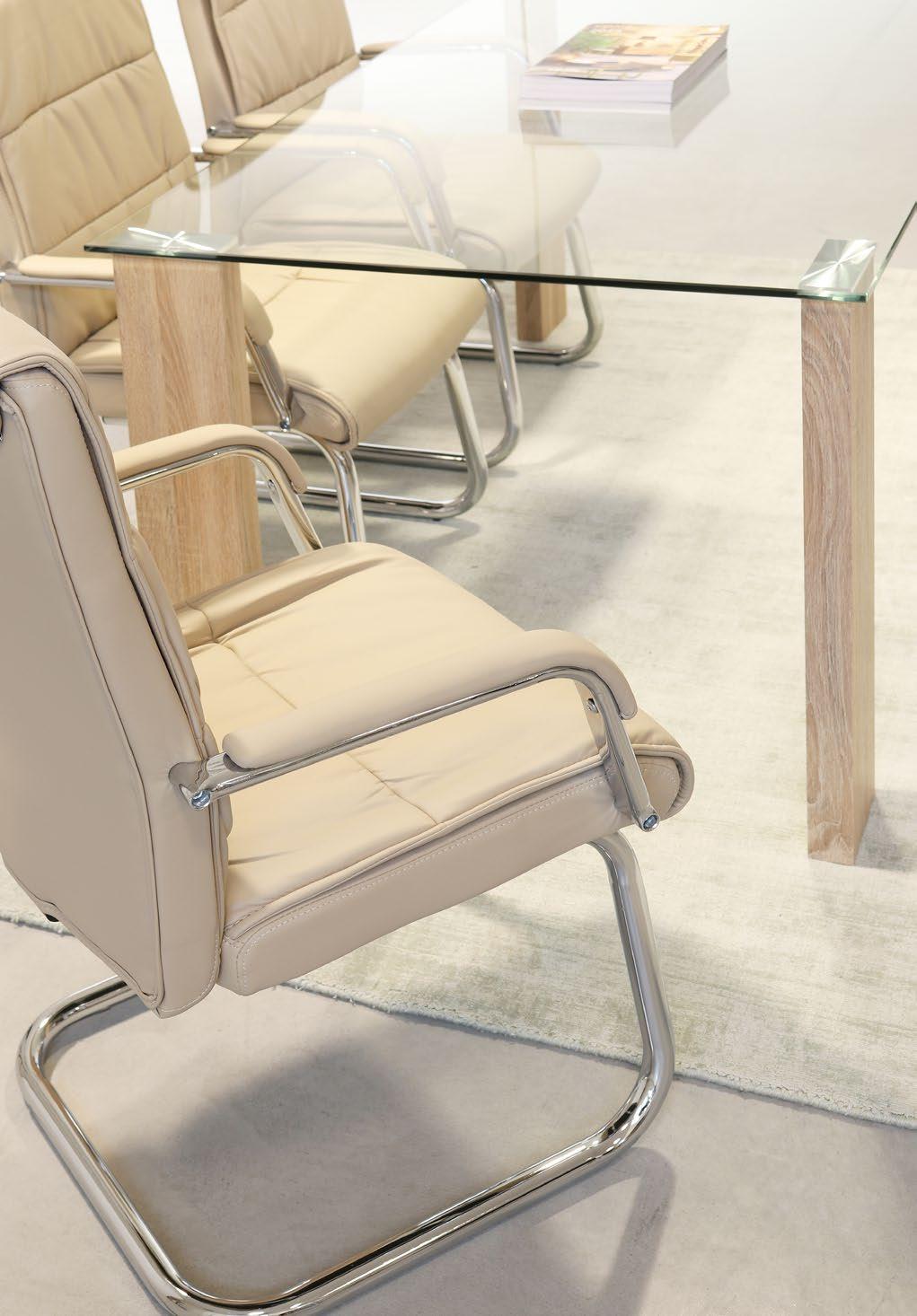 4, 5, 6, Slitta in acciaio cromato. Seduta e schienale imbottiti e rivestiti in similpelle. Braccioli in acciaio cromato con rivestimento in similpelle. Da assemblare | Chromed steel base. Seat and backrest filled with foam and covered in imitation leather. Chromed steel armrests covered in imitation leather. To be assembled