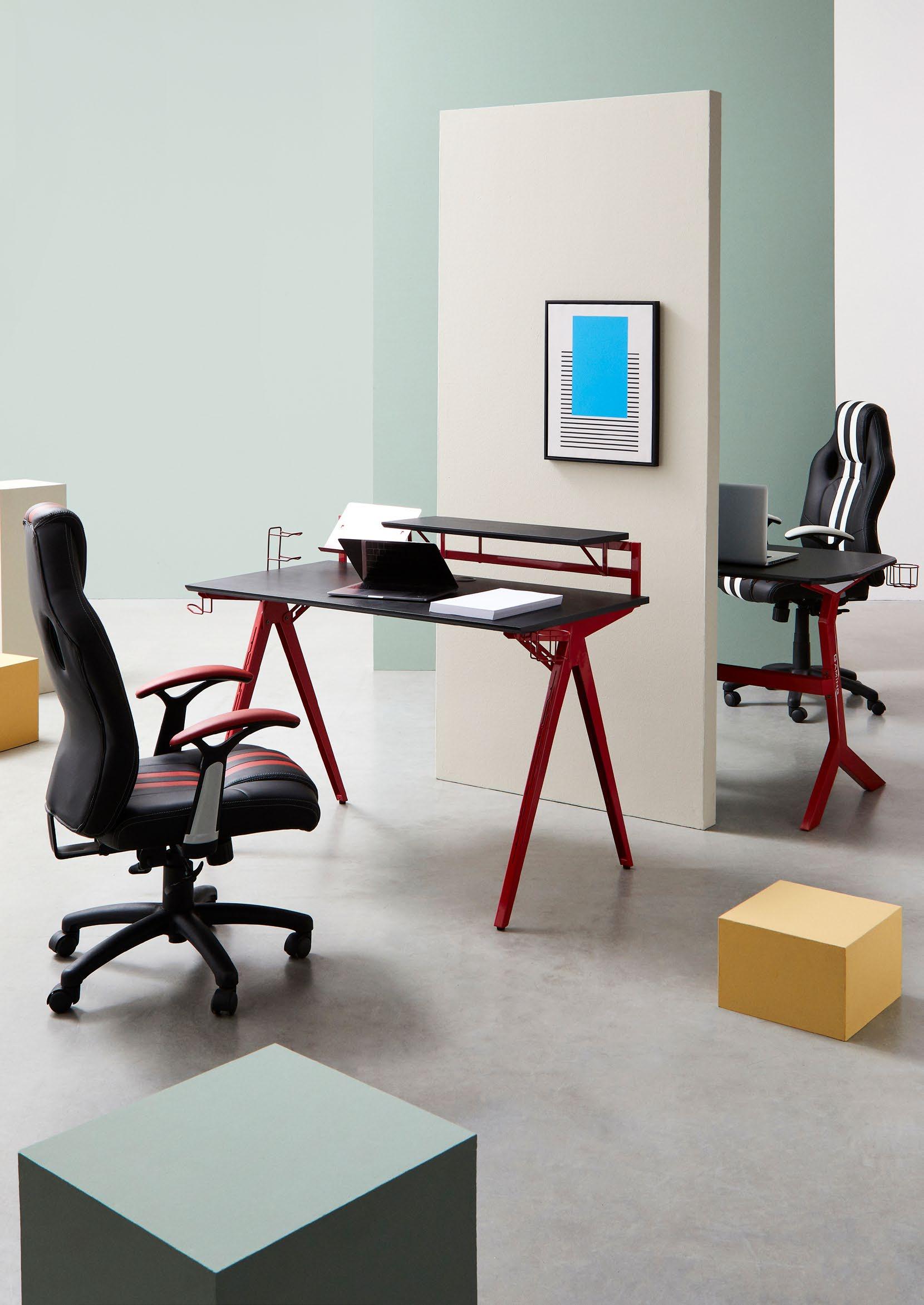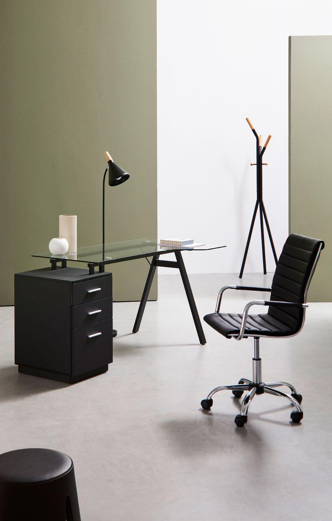 1, 2, Base in acciaio ø76 cm. Ruote in nylon. Seduta e schienale imbottiti e rivestiti in similpelle. Braccioli in plastica (PP)con poggiabraccia rivestito in similpelle. Altezza regolabile e schienale reclinabile. Da assemblare. | Ø76 cm nylon base. Nylon wheels. Foam filled back and seat covered in imitation leather. Reclinable back.Plastic (PP)armrests covered in imitation leather. Adjustable height. To be assembled.