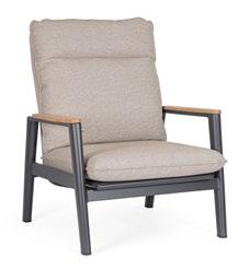 Sofa and armchair: Aluminium, armrests with teak inserts, backrests (with woven Olefin rope) reclining and Textilene seating, removable cushions with Olefin water-repellent fabric (100% polypropylene). Table: Aluminium, sintered stone top (natural stone worked at high temperatures), thickness 11mm, adjustable height with handle.