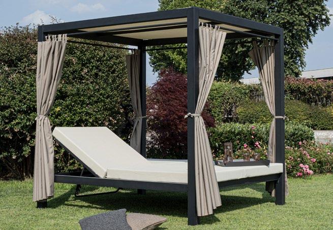 0662478 Daybed DREAM anthracite L | 0662466 Daybed DREAM white L 188 x D 208 x H 205 cm; Aluminium frame powder coated . poles 80x80mm. roof and seat cushions (with removable cover) in textilene 1x1. fast dry foam outdoor filling. back reclinable in 4 positions. polyester side curtains. product to be assembled.