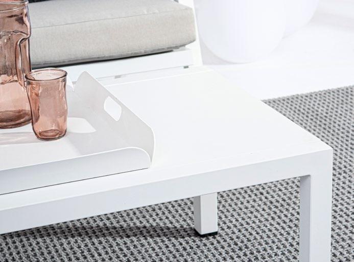 Structure in powder-coated aluminium (polyester). Miguel armchair and sofa, armrests with teak inserts. Backrests with woven Olefin rope and textilene seating 1x1. Stainless steel screws. Backrests to be inserted. Table Miguel with sintered stone top (natural stone worked at high temperatures)(thickness 11mm). Stainless steel screws. Adjustable feet. Legs to be assembled. / Estructura de aluminio con revestimiento de polvo (poliéster). Sofá y sillón Miguel, reposabrazos con inserciones de teca. Respaldo con entramado de cuerda Olefin y asientos de textilene 1x1. Tornillería de acero inoxidable. Respaldos para insertar. Mesa Miguel, tablero de piedra sinterizada (piedra natural trabajada a altas temperaturas - espesor 11mm). Tornillería de acero inoxidable. Pies regulables. Patas para montar.