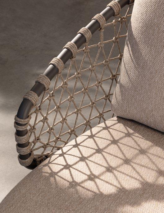 La corde qui s’entrelace. Elle se entrelace à la structure en aluminium et au bois de teck. Tamires tisse ce lien spécial et symbiotique avec l’espace environnant, avec la nature, pour une relaxation absolue et profonde.