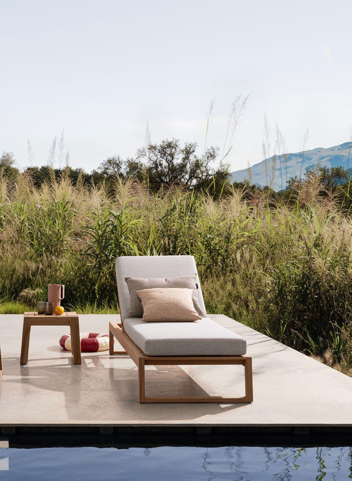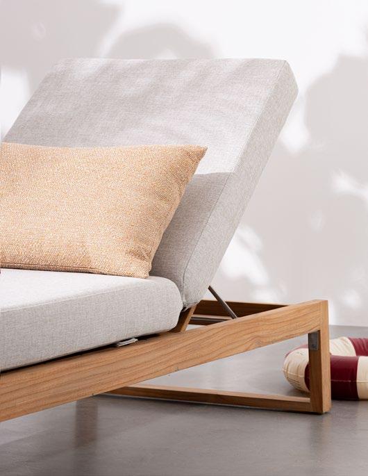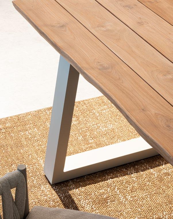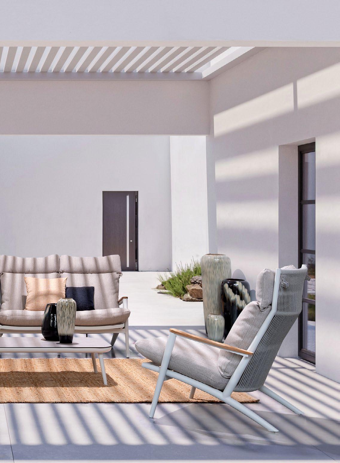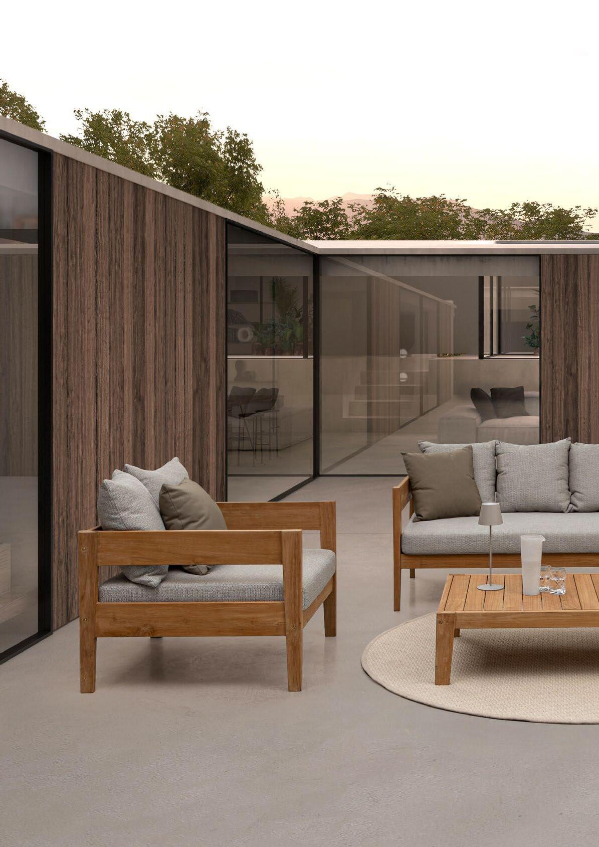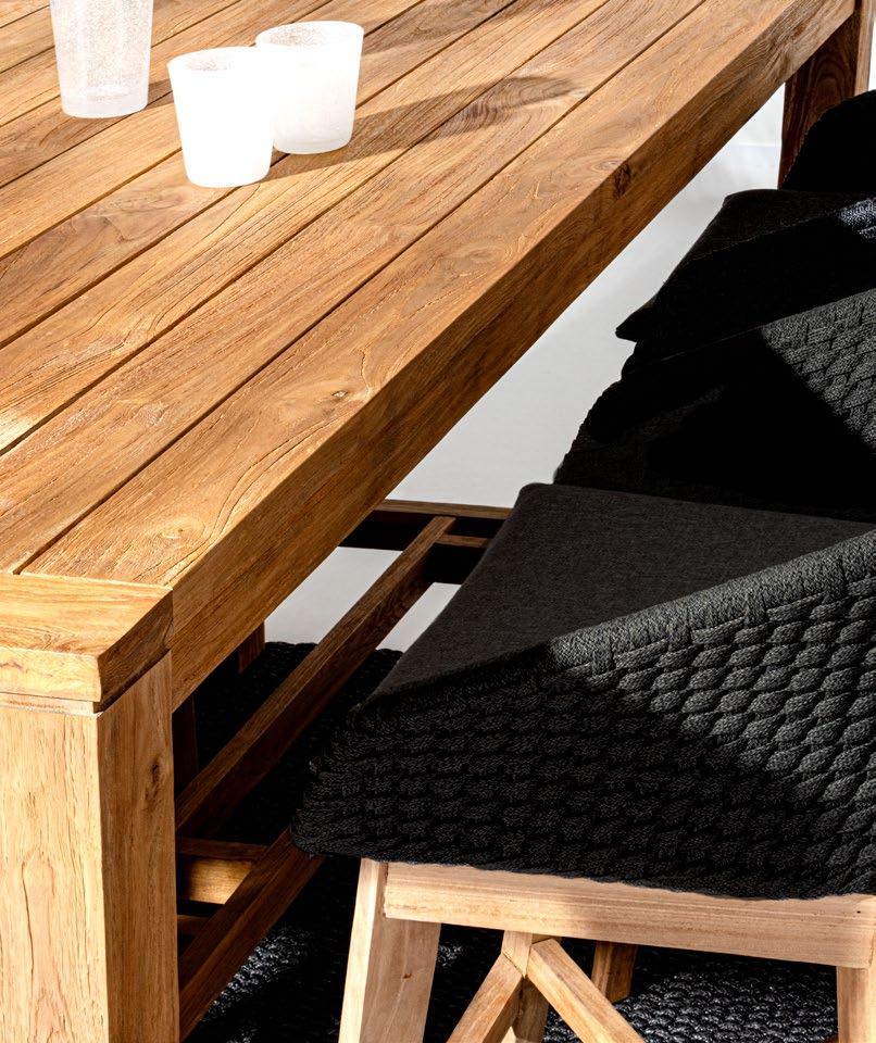 Aluminium et teck pour les tables, acier inoxydable pour les chaises et le canapé. L’essentialité rencontre la douceur : les grands coussins sont tous déhoussables et en tissu déperlant.