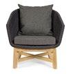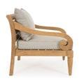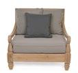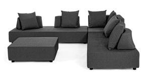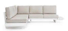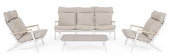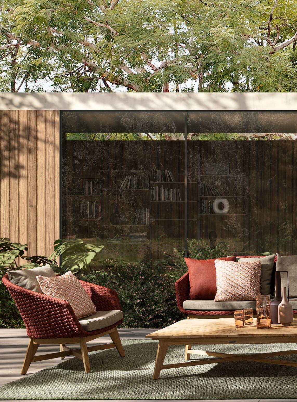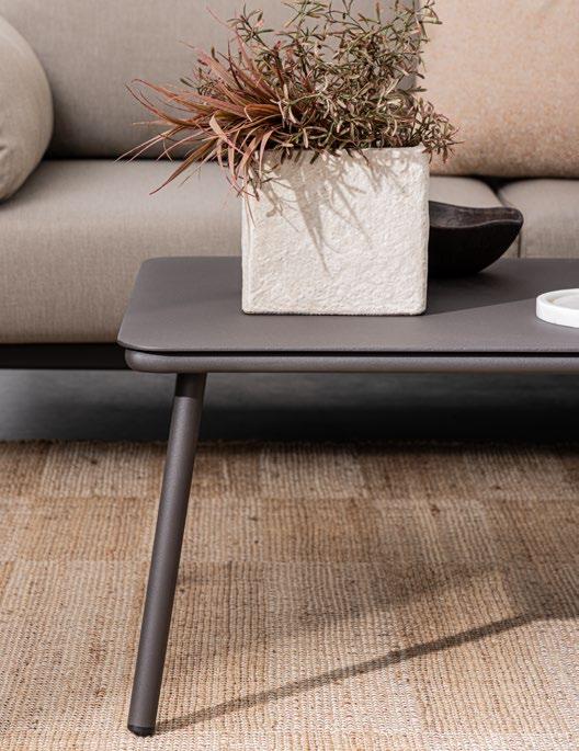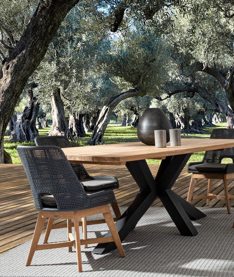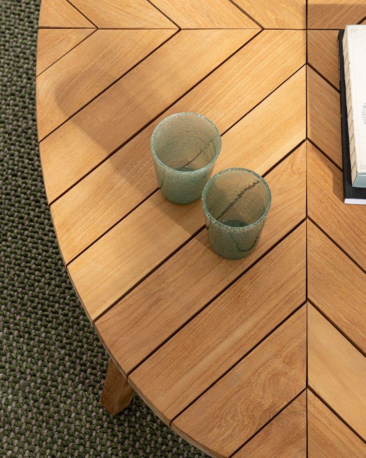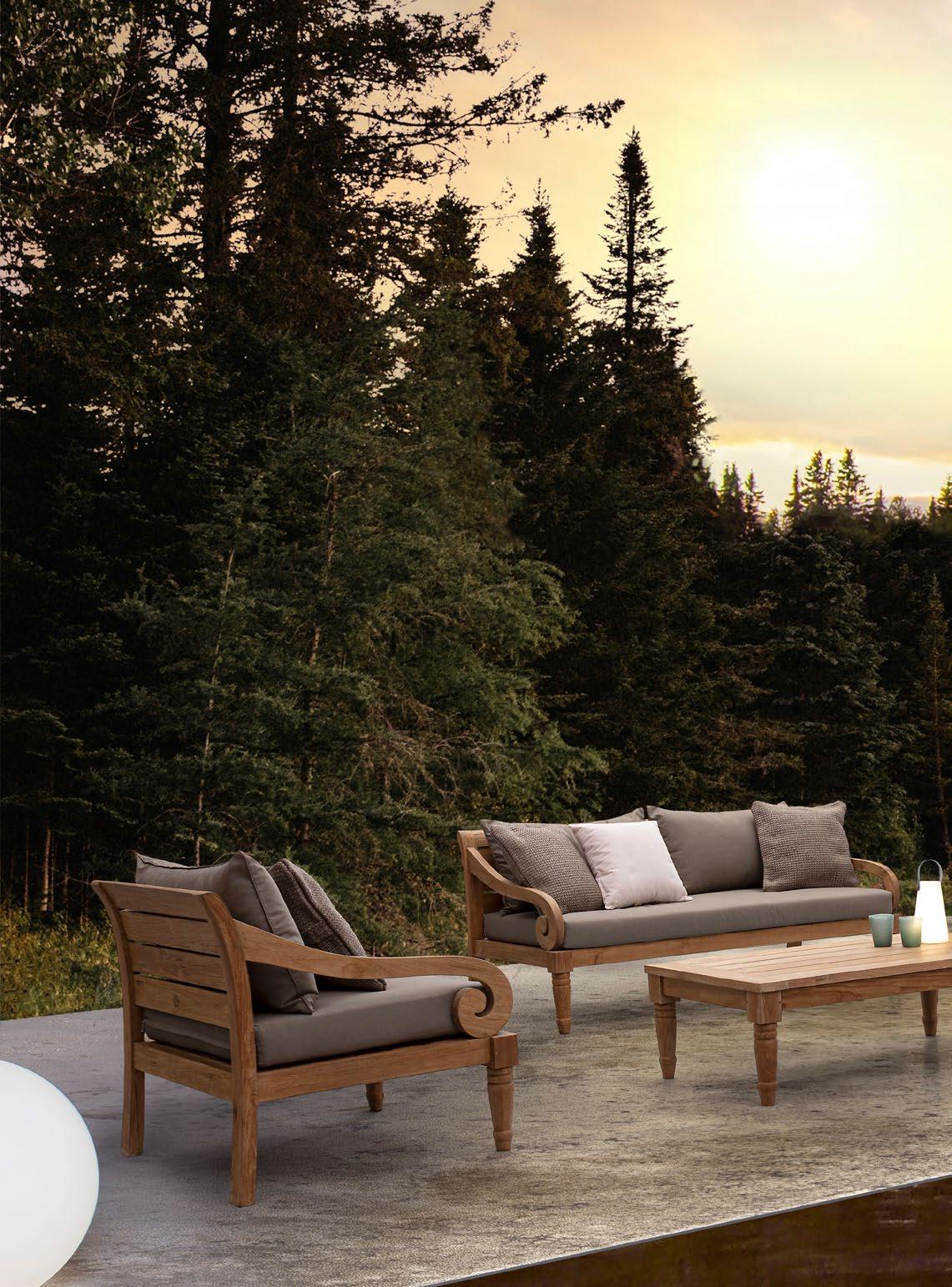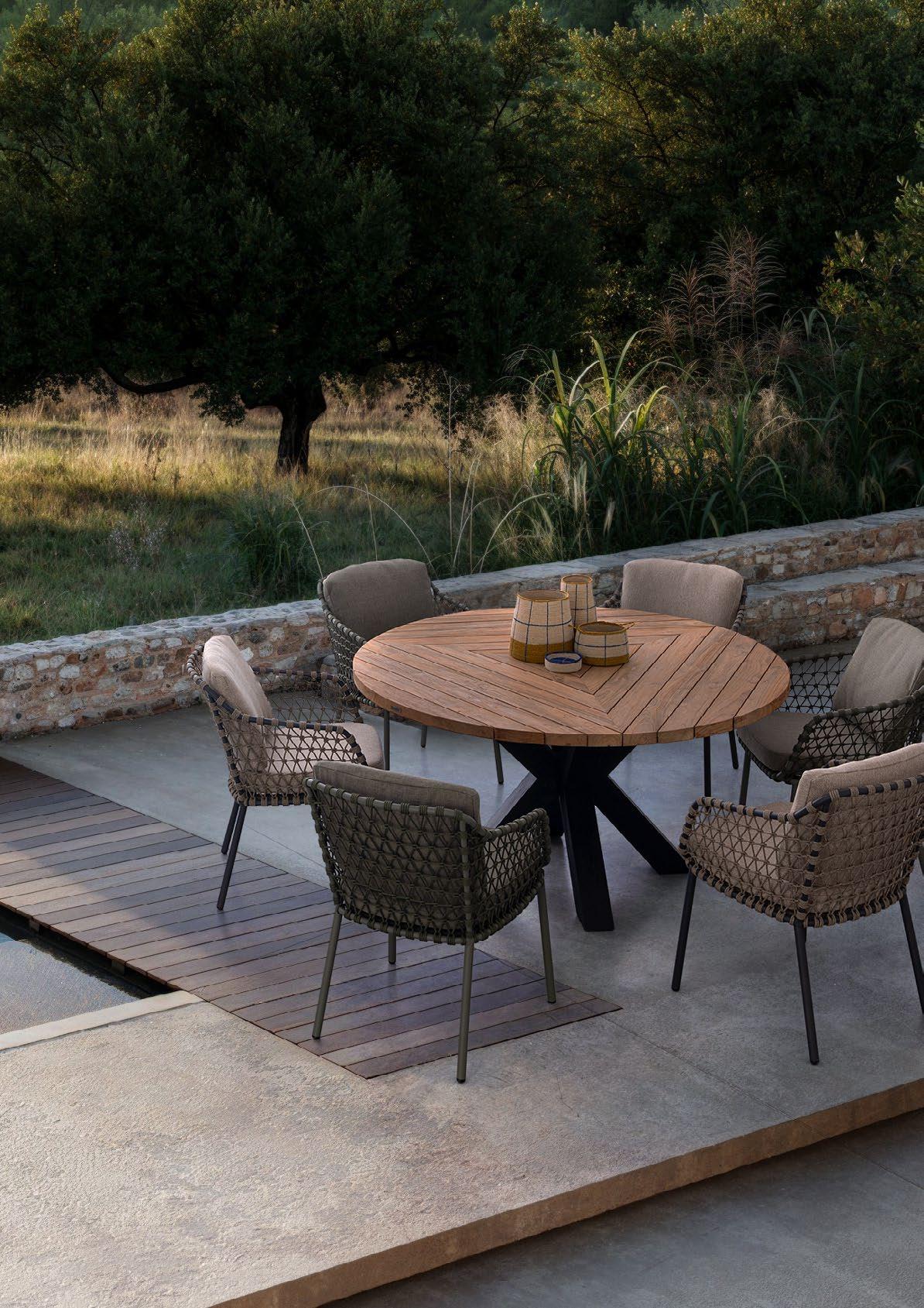 Aluminium et teck pour les tables, acier inoxydable pour les chaises et le canapé. L’essentialité rencontre la douceur : les grands coussins sont tous déhoussables et en tissu déperlant.