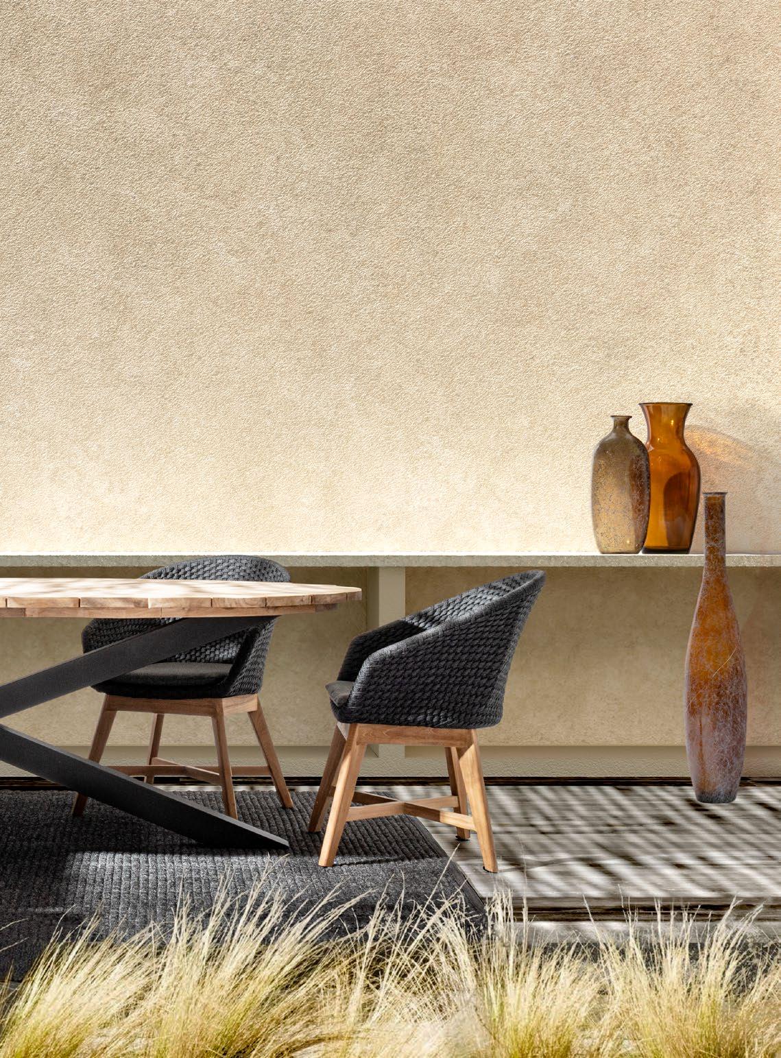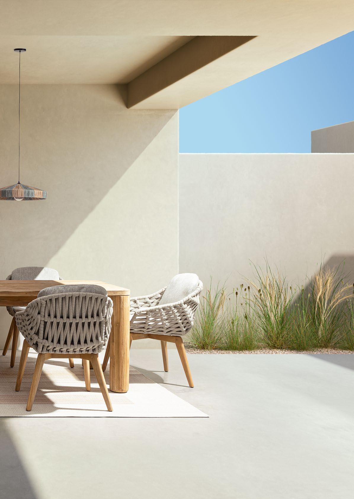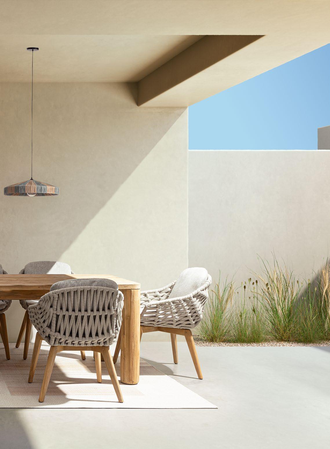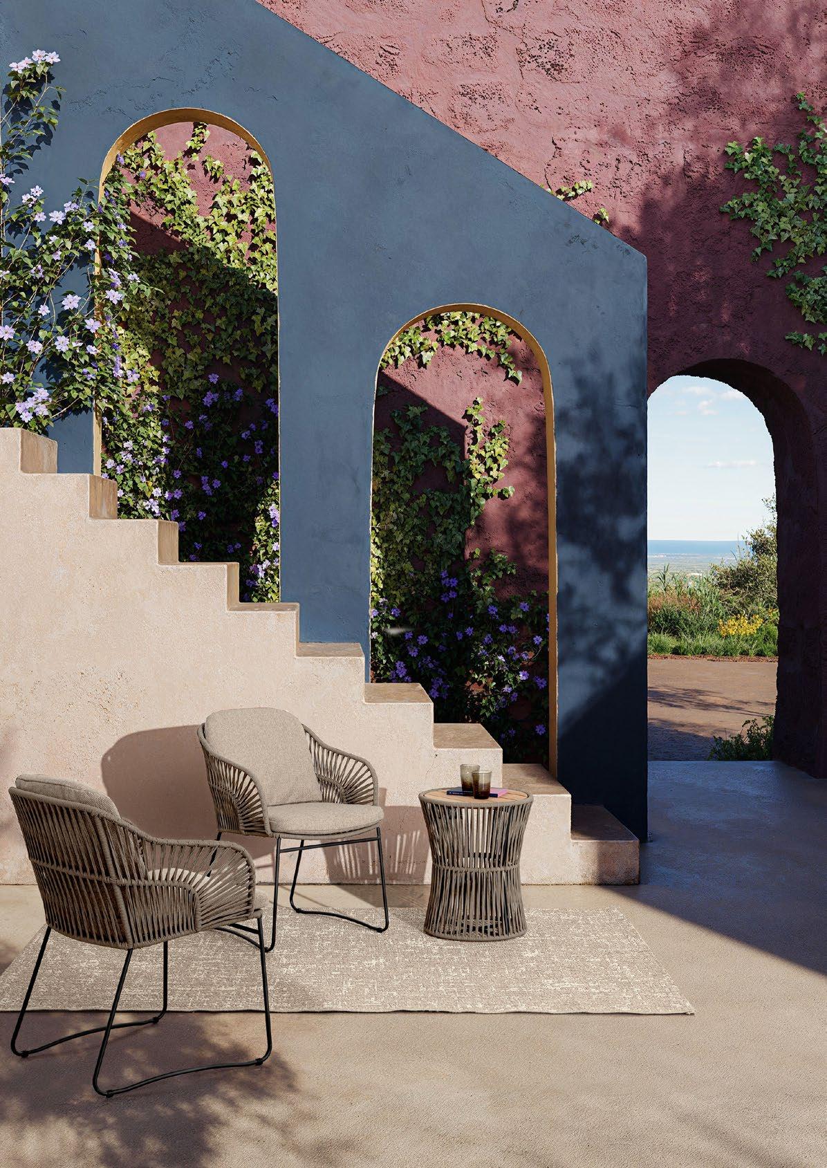 Gesinterter Stein und Seil. Die Modernität eines neuen Materials und die Tradition eines alten Materials. Mit ihren unterschiedlichen Stilen bieten Julian & Ivissa einen angenehmen Kontrast, perfekt für kleine oder große Außenbereiche.