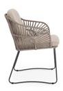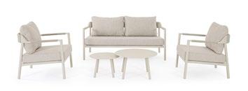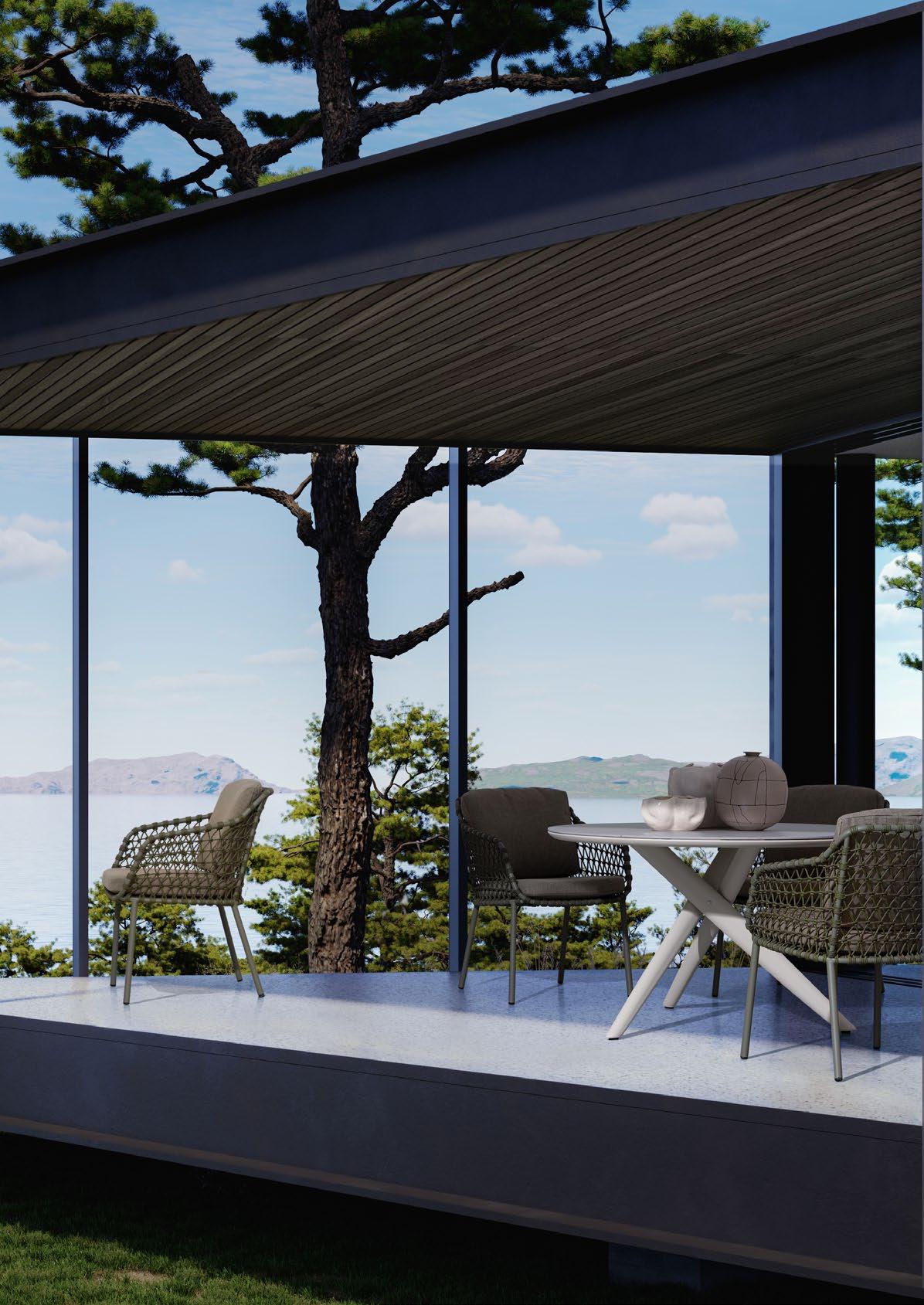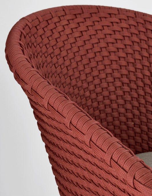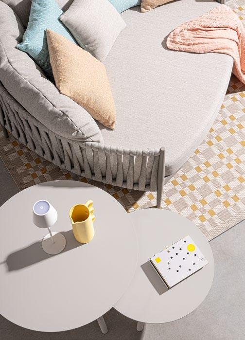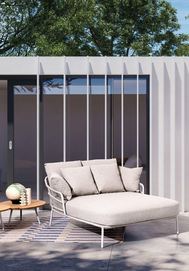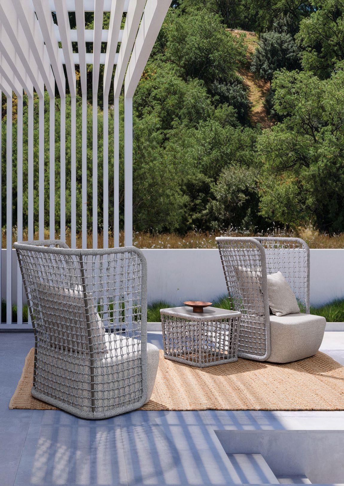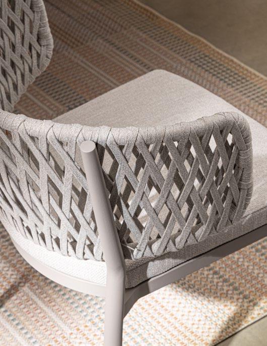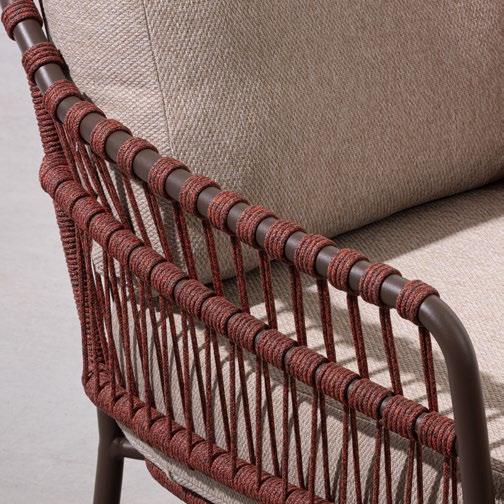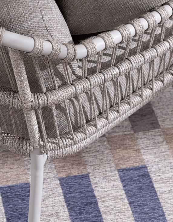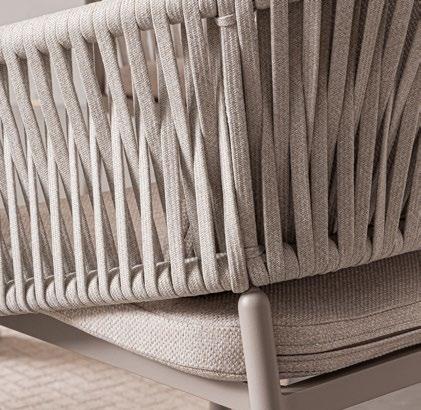 Florencia est raffinée. Un design essentiel pour la structure en aluminium peint et, au centre, les longues cordes qui forment le dossier des chaises, des canapés et des fauteuils. Comme le cordier d’une harpe, recréant des harmonies relaxantes.