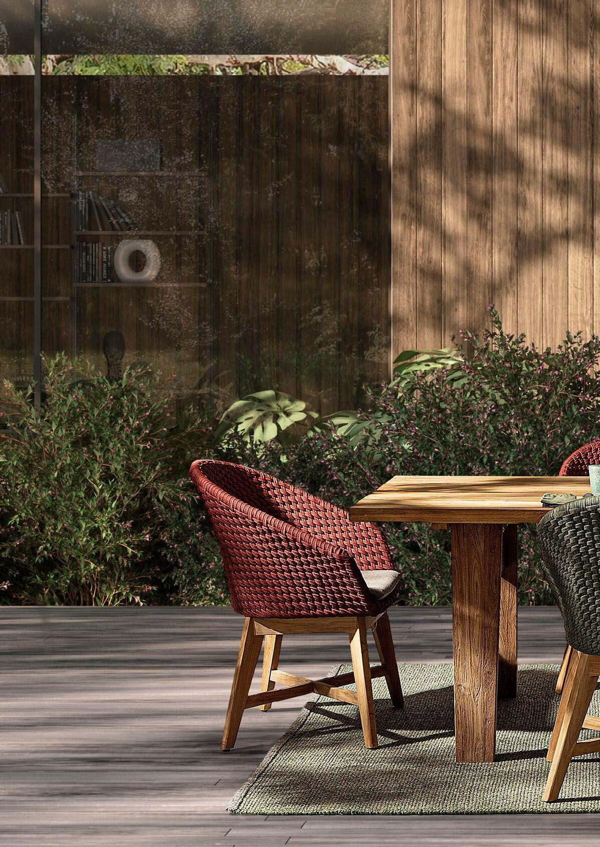Corde et bois. Douceur et robustesse. Roderick et Ivissa sont une rencontre de styles unis par le naturel que les couleurs et les matériaux restituent. La table Roderick est fabriquée en bois de teck recyclé provenant de forêts durables: chaque pièce qui la compose a une tonalité et une forme différente, qui garantit son originalité.