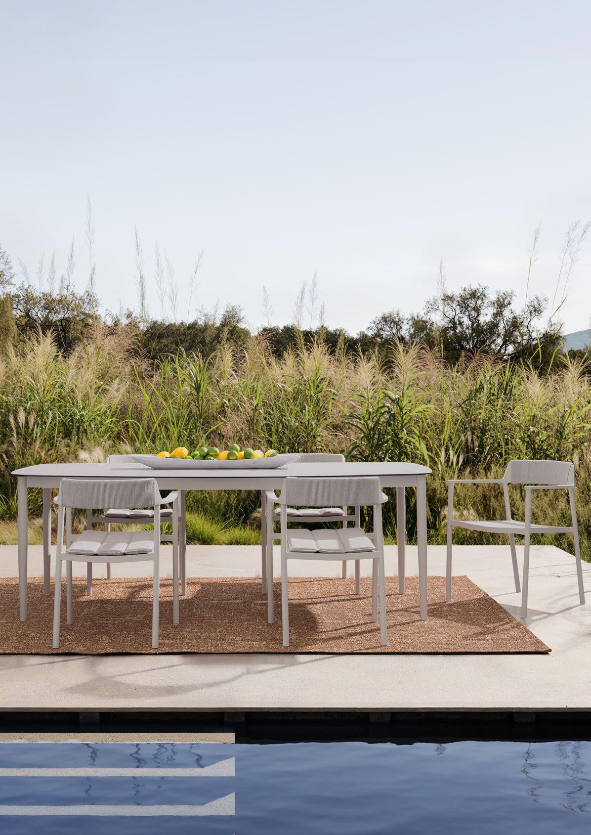 Schlichtheit und Leichtigkeit. Die wesentlichen Linien des Tisches Arnold treffen auf die des Stuhls Repery. Beide aus lackiertem Aluminium, mit einer innovativen Platte aus gesintertem Stein, die bei hohen Temperaturen bearbeitet wird und sehr widerstandsfähig ist, der Tisch, und mit Polyester-Seilgeflecht auf der Rückseite, der Stuhl.