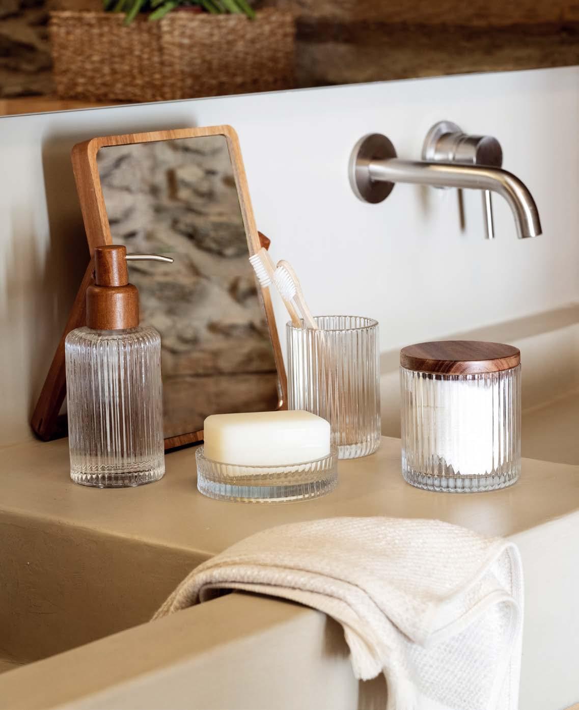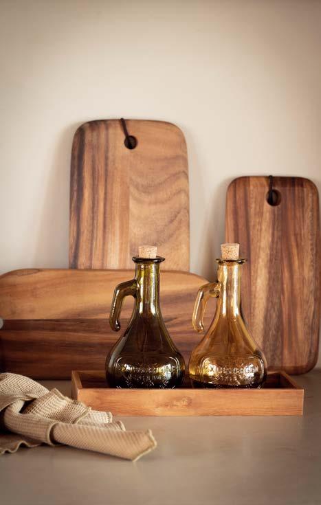 Woods with a natural finish that pamper the ingredients, and kitchen utensils that bring back traditional materials like rattan, glass, cotton, and porcelain.
