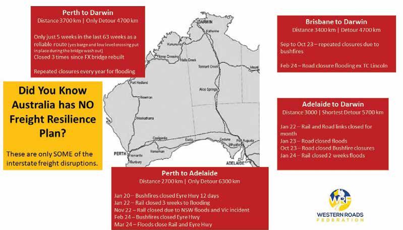 25 WATM • April 2024 18/9 Inspiration Drive Wangara WA 6065 PHONE: NEVILLE BAKER 0419 515 151 www.tyreequipment.com.au sales@tyreequipment.com.au TYRE EQUIPMENT TRUCK TYRE CHANGER TRADER YOUR SPACE This space could be your spot to reach over 10,000 readers in the Western Australian transport and associated sectors. Contact Karen at Karen@angrychicken.com.au or Ph 0430 153 273 ON THE ROAD The ‘must have’ book for transport operators giving you the locations (distances) of Transport Parking Bays, Bridge information, roadside facilities and their services throughout mainland regional Australia. Hurry Limited copies left Only $30 plus postage TO ORDER visit www.angrychicken.com.au karen@angrychicken.com.au Having trouble finding space in rest areas? WA GRAVEL TRACKS in this edition TRUCKS FRESH OFF THE PRESS Australian Parking Bays, bridges and roadside facilities HARD COPY POSTED TO YOU Last published in 2010 (note, no updates – this is a reprint only), On the Road – Trucks gives you the distances (pegs) of truck parking facilities, bridges and roadside facilities nationally plus suitable dirt tracks in Western Australia. Printed with a hard cover, wire bound A4 format, the internal pages can be easily written on so you can keep your own notes. $50 plus postage within Australia * Can be picked up from Henley Brook, Western Australia. ALSO AVAILABLE IN DIGITAL FORMAT – $30 Can be printed or stored on your phone and is emailed to you in PDF format To receive either option, email karen@angrychicken.com.au with your name, company name and postal details (hard copy), or nominate the PDF copy and you will receive a tax invoice with EFT details Angry Chicken Publishing Pty Ltd | M 0430 153 273 Route Route Guide Midland to Wyndham Wyndham to WA/NT border (Victoria Hwy) Muchea Geraldton Geraldton to Hedland Bindoon to Dongara Wubin to Mullewa North West Hwy to Onslow North West Hwy to Exmouth Nanutarra Tom & Paraburdoo Tom Price Ring Road Great Northern Hwy to Paraburdoo The Lakes to Merredin via Northam Pithara Geraldton Leinster Mt Magnet Newman to Gt Northern Hwy via Nullagine Marble to Telfer Woodie Woodie Perth to Kalgoorlie Order Form Coolgardie to Esperance Norseman to WA/SA Border, Border Village Kambalda Meekatharra Leonora to Warburton Laverton Kelmscott to Ravensthorpe Roelands Lake King via Collie Free Updates for OTR Perth NorthamAlbanyCranbrook Albany to RockinghamEsperance (Perth) to Bunbury via Mandurah Armadale to Albany via Pinjarra & Bunbury Border Village SA/WA Border to Port Augusta 51-53 Ceduna to Port Lincoln Port Augusta to Port Lincoln Port Augusta to SA/NT Border via Coober Pedy Port Augusta to Adelaide Warnertown to Monash Renmark SA/NSW Border 57 Warnertown to Peterborough Jamestown Gawler to Cockburn SA/NSW Border 59-60 Adelaide to Paringa Border Tailem Bend to SA/Vic border Pinnaroo 61-62 Adelaide SA/Vic Border Gambier Tailem Bend SA/Vic border Bordertown Keith Mt Gambier NSW/SA Border Nyngan 64-66 Nevertire Coonabarabran 67-68 Nyngan to Narromine 68 Coonabarabran NSW/Qld Border Goondiwindi 69-70 Dubbo INDEX Meekatharra Newman Port Hedland Broome FitzroyCrossing HallsCreek Kununurra Wyndham Mandurah BunburyBusselton Geraldton Exmouth Karratha Price Paraburdoo Magnet Newcastle Waters Daly Waters Alice Springs Coober Pedy Newcastle Port Macquarie Harbour Grafton Lismore Tweed Heads Maroochydore Emerald Rockhampton Mackay Townsville Charters Towers Marla Dongara Manjimup arburton Mullewa Derby Richmond Roma Onslow Moora Leinster MarbleBar LavertonLeonora Kulgera Broken Hill Dubbo Wilcannia Narromine Coonanarabran Nyngan Goondiwindi Moree Narrabri Singleton Katherine Tennant Creek Camooweal Mt Isa Cairns Winton Cloncurry Blackall Toowoomba Barcaldine Millmerran Barringun Bourke AugathellaCharleville Belyando Carnarvon Perth Darwin Brisbane Tamworth Glen Innes Muswellbrook GilgandraDunedoo algett George Hebel Ballina Coral Bay Woomera Normanton LyndJunction MountMossmanMolloy Clermont Longreach Gladstone Maryborough Biloela Springsure Westwood Nanango Dalby Cunnamulla Ipswich Warwick Caboolture Three Ways RoadTrucks Final.indd 22/11/10 to fuel. showers. accommodation. workshop Meekatharra Wubin Miling Dalwallinu Cue Newman NORTH alebing Paynes Find Oudabunna New Hwy Tuckanarra Katalundie Roadhouse Mt Magnet Wydgee Kirkalocka Capricorn Roadhouse NORTH Hwy Munjina Roadhouse Great Northern 167 Bindi 177 West ColvinsRoad Both MilingHotel Fu Park 204 East PiperMcNeillRoad 220 East PitharaGrain West CourtleaRoad Dallwallinu Shelter 241 East NugudongRoad 248 West Wegners Wubin Fu.F.T.S.Phone 254 N/East JimberdingRoadhouseWubin Fu.F.T.S 255 North WubinRoadTrainArea Wubin East SymesCrossing Shelter 275 East Jibberding Shelter 288 East GoodlandsPark 300 West The Shelter East Gibson 337 Gibson 357 West MtSingleton 370 East Ninghan 386 West NyoundaHills 398 East MtHarry 402 East MtEden West PaynesFind T.S ThundelarraPass 438 West Oudabunna 446 East NarndeePark Cooladar 478 Kirkalocka 484 East CooloalooHills West Wogarno Meeline GravelPit 524 East Iowna 548 West JumbulyerHills 551 East MtMagnetRoadhouse 552 West SwagmanMtMagnetRoadhouse Fu.T.S 553 MtMagnetCreek 571 Both Wandarriet/o 606 East AustinTownsite UtePark 609 West LakeAustin 617 West MainlandStation West DairyFlat Km Side Bridge Peg Road Name Comments Services WA Great Northern Hwy 95. 1. Midland to Wyndham Continued Final.indd 22/11/10