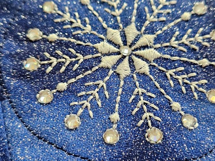 You probably didn’t notice when I shared the snowflake picture before, but there were little circles at the end of each stitching line. Yes – those are placement stitches in which you can fuse crystals. They look amazing with all their glitz!