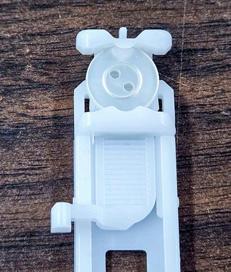 After choosing the buttonhole style, take your button and load it into the One-Step Buttonhole Foot. There’s a spot at the back of the foot to load the button, which ensures the buttonhole is the correct size for your button. Pull the little lever down on the left and insert the button, then push the lever up to hold the button in place, and your buttonholes will be perfectly sized to your button every time!