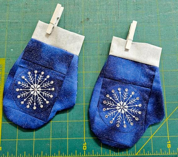 The last thing I’ll share is my mitten ornaments. I did the machine embroidery on the Designer Quartz 29 earlier. I trimmed the snowflakes and added fabric around them, making them large enough to cut out the mitten template. I added a cuff. The glittery clothespins allow them to be attached to a garland or a tree. They are an adorable project for the embroidery machine. Remember that snowflake design came from the mySewnet Library!