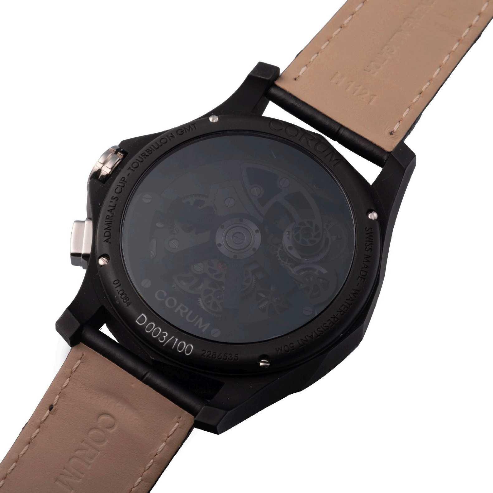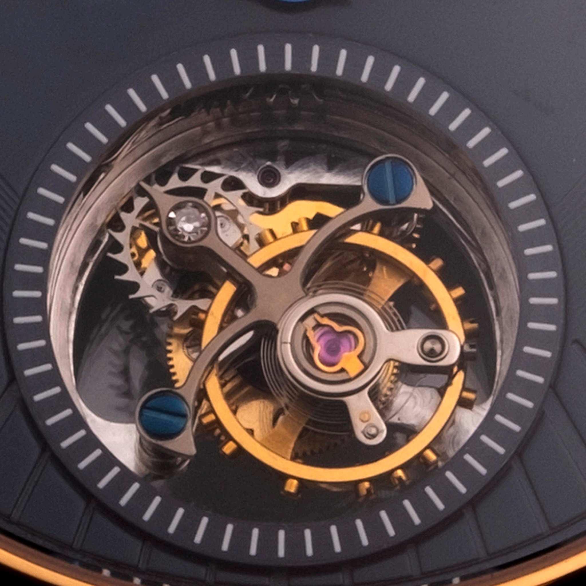 A large, fine and heavy, 18k yellow gold, manual wind tourbillon wristwatch with a blue dial, retrograde date and sapphire case back.