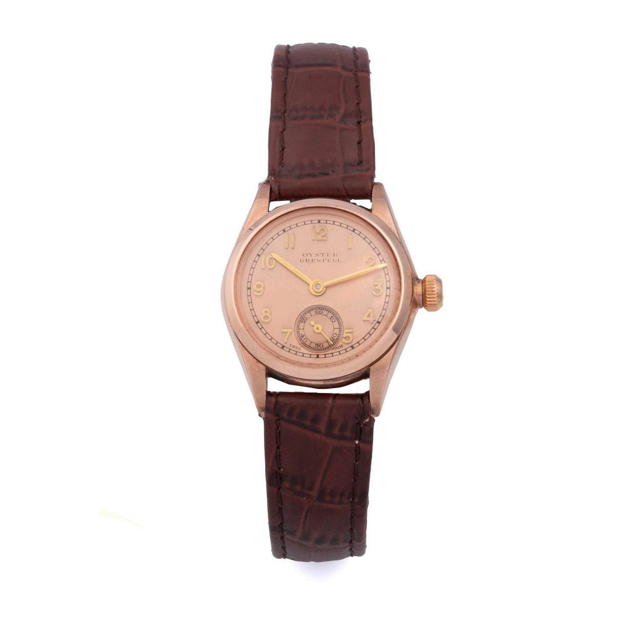 This is a 1940s Oyster Grenfell, part of the Canadian Oyster series. The Grenfell is one of the rarer variations, making it a noteworthy collector’s piece. The gold-filled case measures 29mm and retains its original Oyster-patented winding crown. The stainless steel Oyster case back dates this watch to 1938.These Canadian Oyster watches were marketed to soldiers heading overseas during World War II and remain an under appreciated piece of horological history.