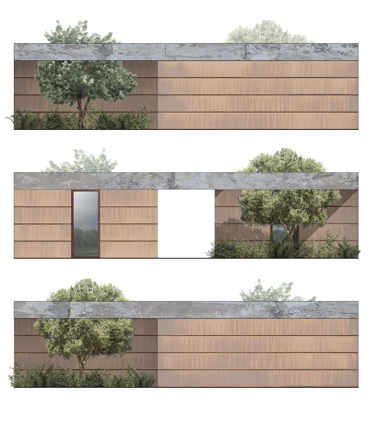 Cubrición mediante aplacado de paneles cerámicos color ladrillo, fijados a la subestructura metálica mediante UPN y perfiles tubulares en C, albergando en el