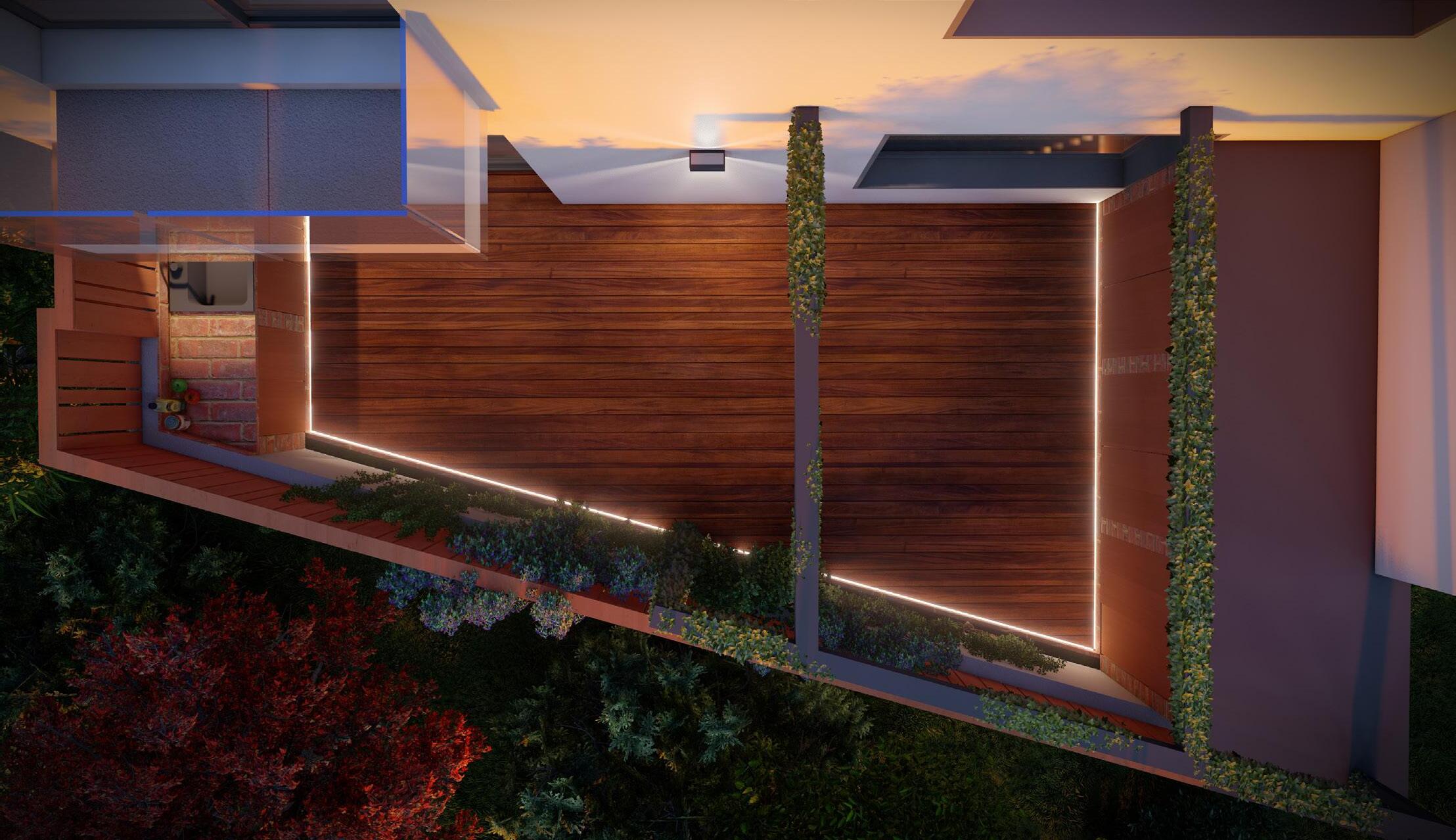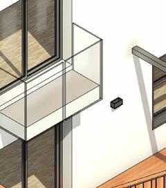 Carpintería fija de vidrio doble con cámara de aire, anclada mediante un perfil UPN a una subestructura metálica de montantes cuadrados. Los reflejos solares son tamizados por el juego de vegetación que cuelga desde la cubierta.