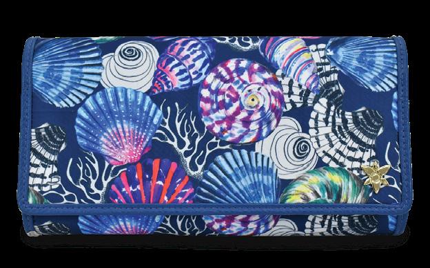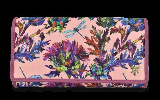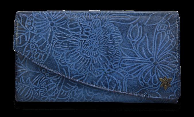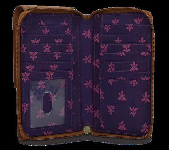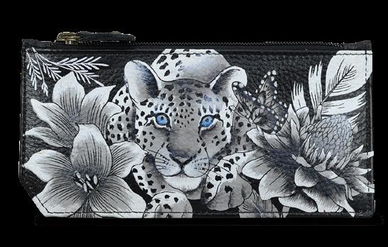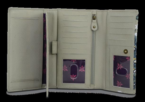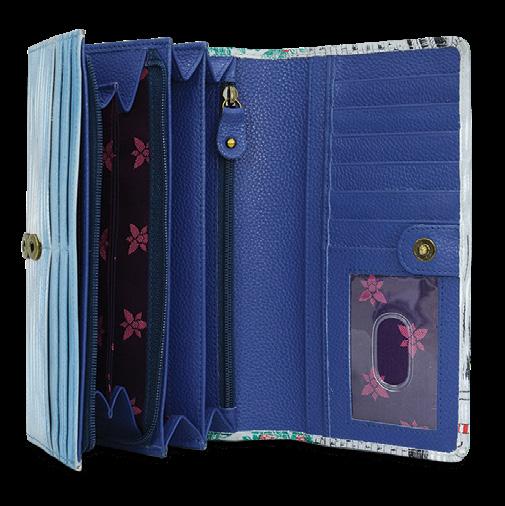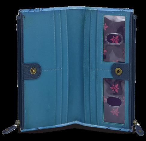 Flap open entry with adjustable snap closure. Three full-length slit pockets. Two full-length zip pockets. Eleven RFID protected card slots. One ID window. One gusset compartment.