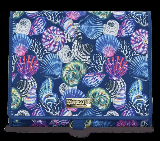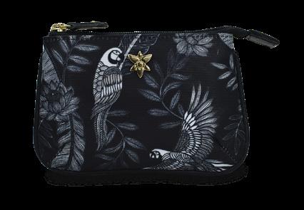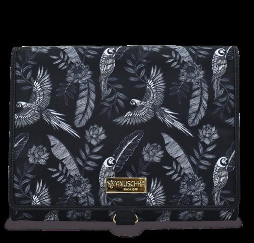 Flap with double snap button. Two zippered transparent pockets with gusset. One zippered transparent wall pocket.