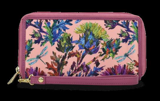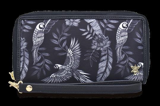 All round zip entry. Eight RFID protected card holders. Two slip in pockets. One central zippered pocket.