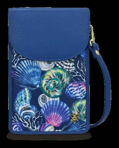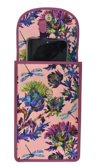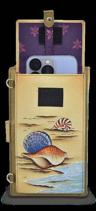 Magnetic flap entry phone phone. Rear flap organizer with hook and loop. 5 card holders with RFID protection. Passport holder.