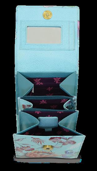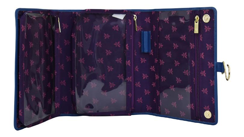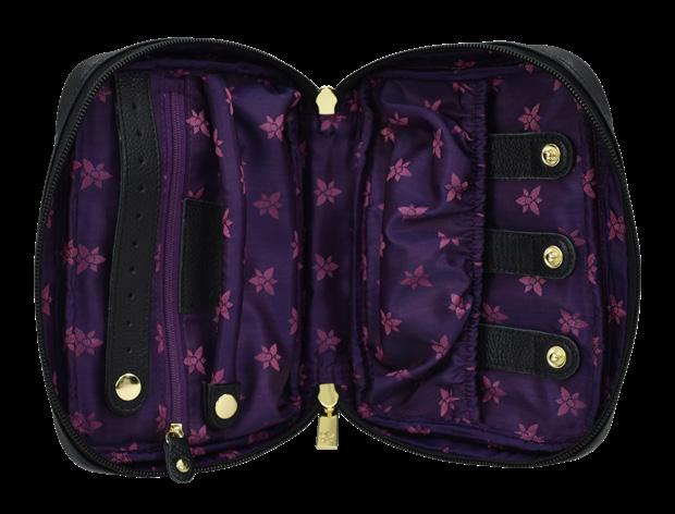 All round zip entry. One zippered wall pocket. One open expandable pockets. Strap to store 5 pairs of ear rings. Necklace holder. One zippered partition pocket, four slip in pockets. Rear full length zippered wall pocket. Three multipurpose holders.